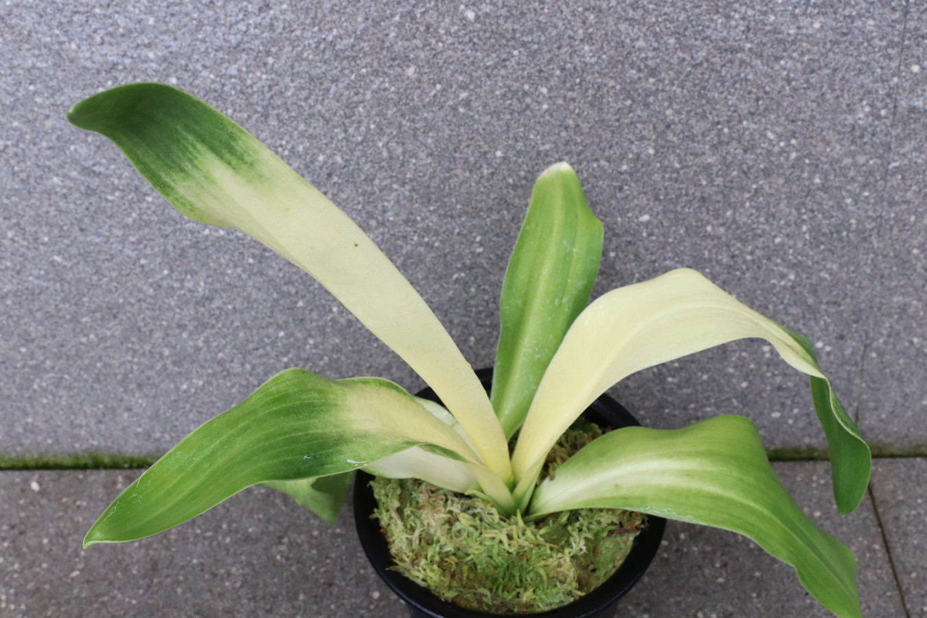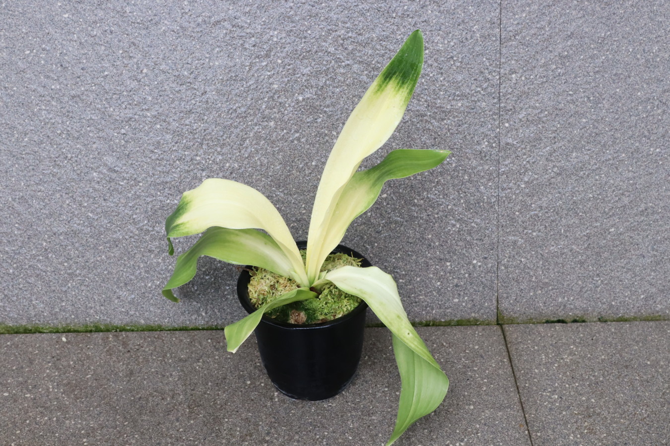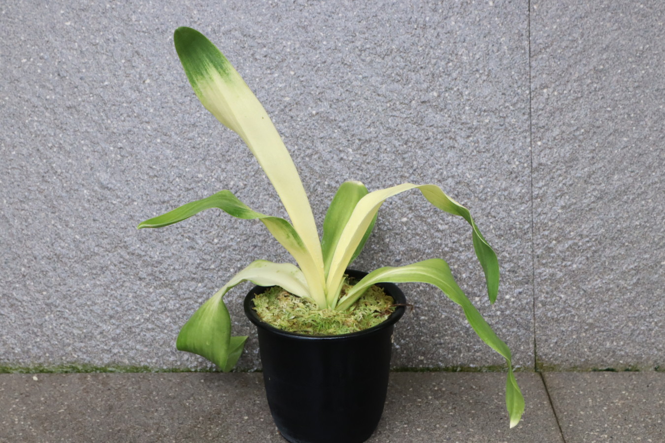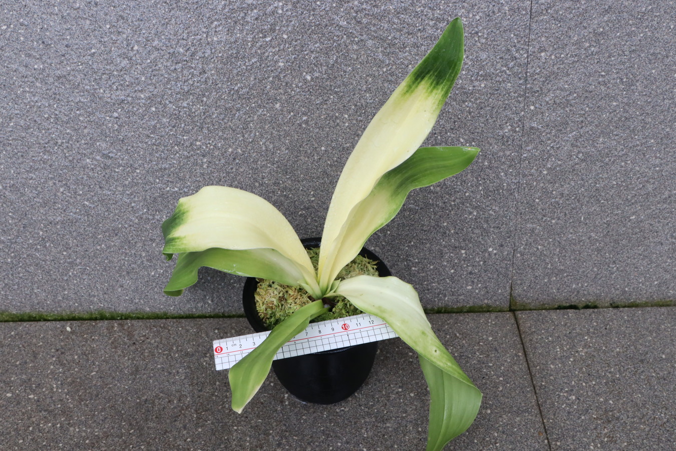 交換会で売りに出された2枚葉の実生を求め作る。葉幅が広く立ち葉性で紺性強く、その中に独特の卵黄色の美しい曙虎を現す。曙系品種は多種多様だが、その中でもひときわ目を見張る美しさがある。葉長40㎝、葉幅8㎝内外。性質はやや弱いところがあります。子上は大変良く、根出しも良い。肥料を控えめに与えれば栽培が容易な品種で4月~6月に十分日光に充てて作ることにより美しい曙虎を現す。美麗品。