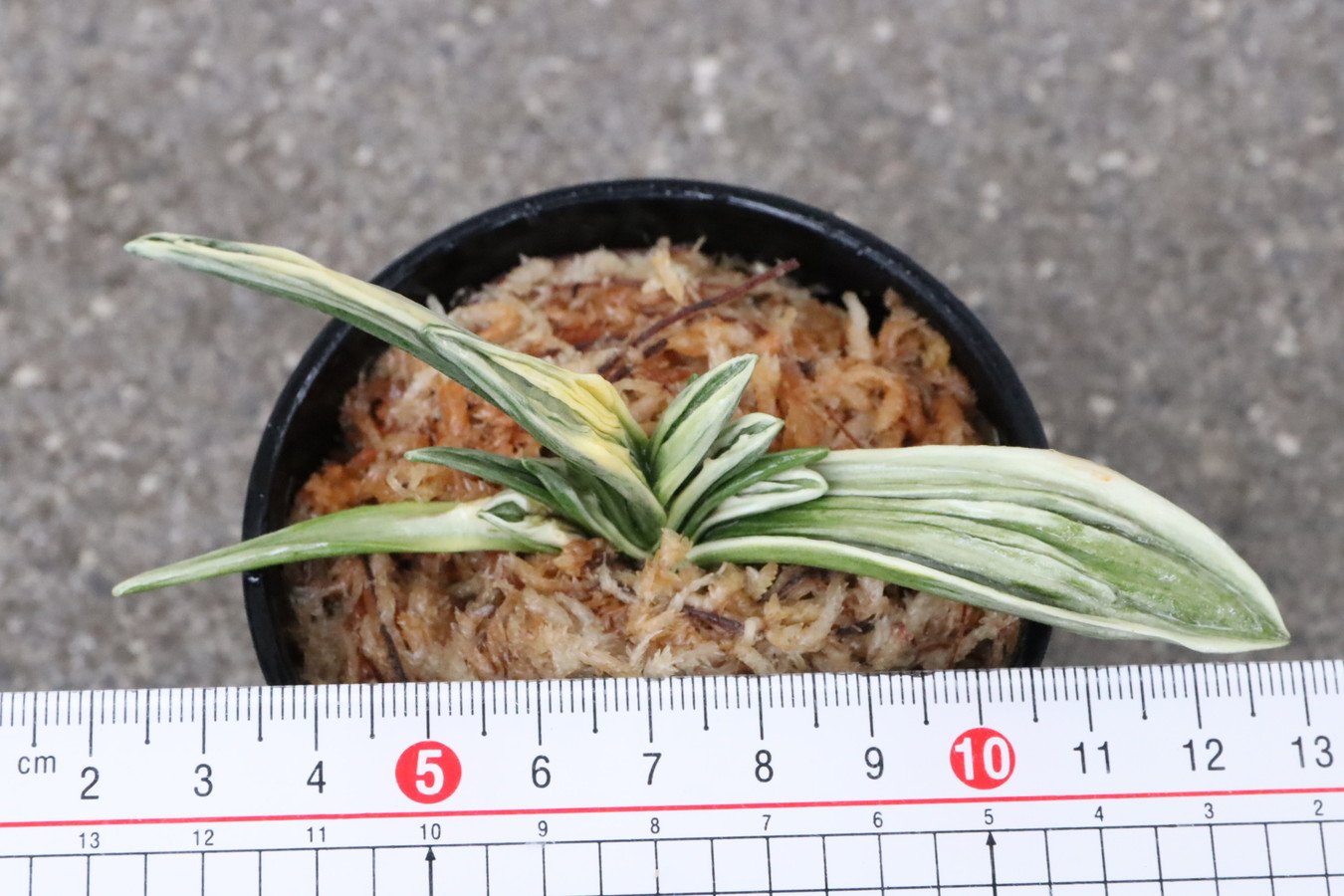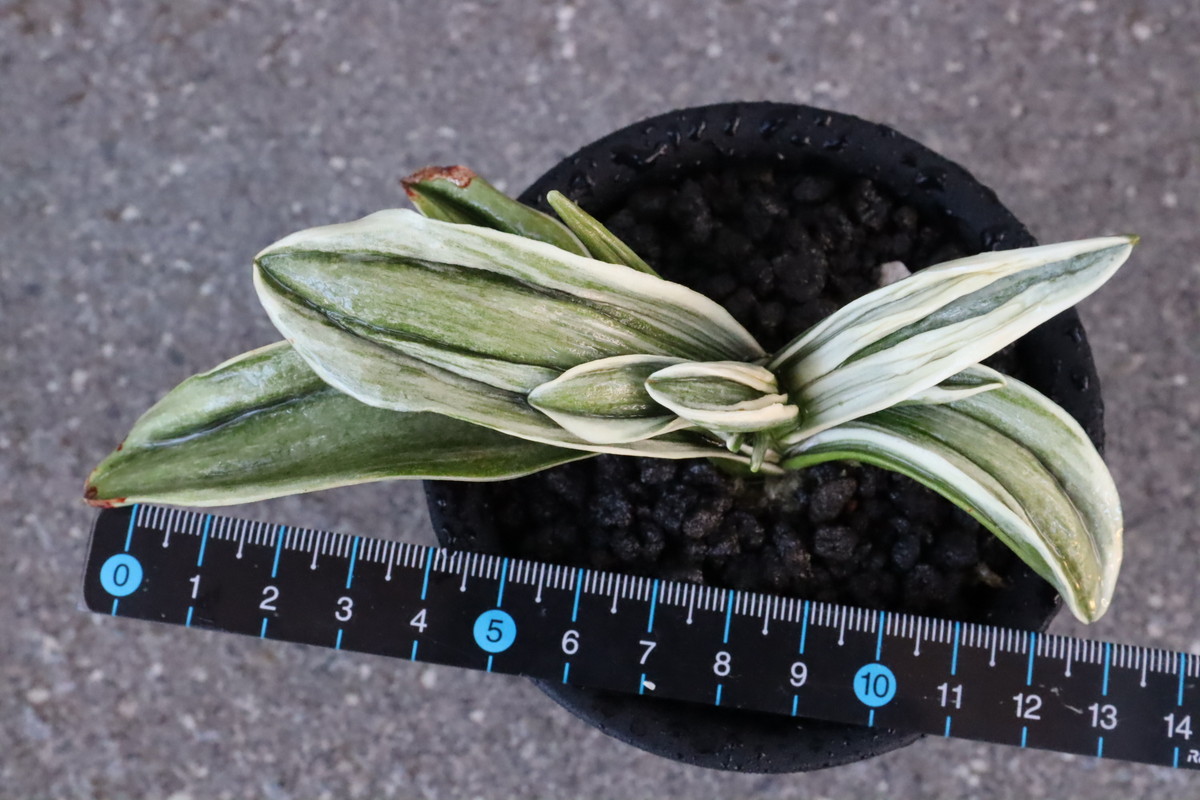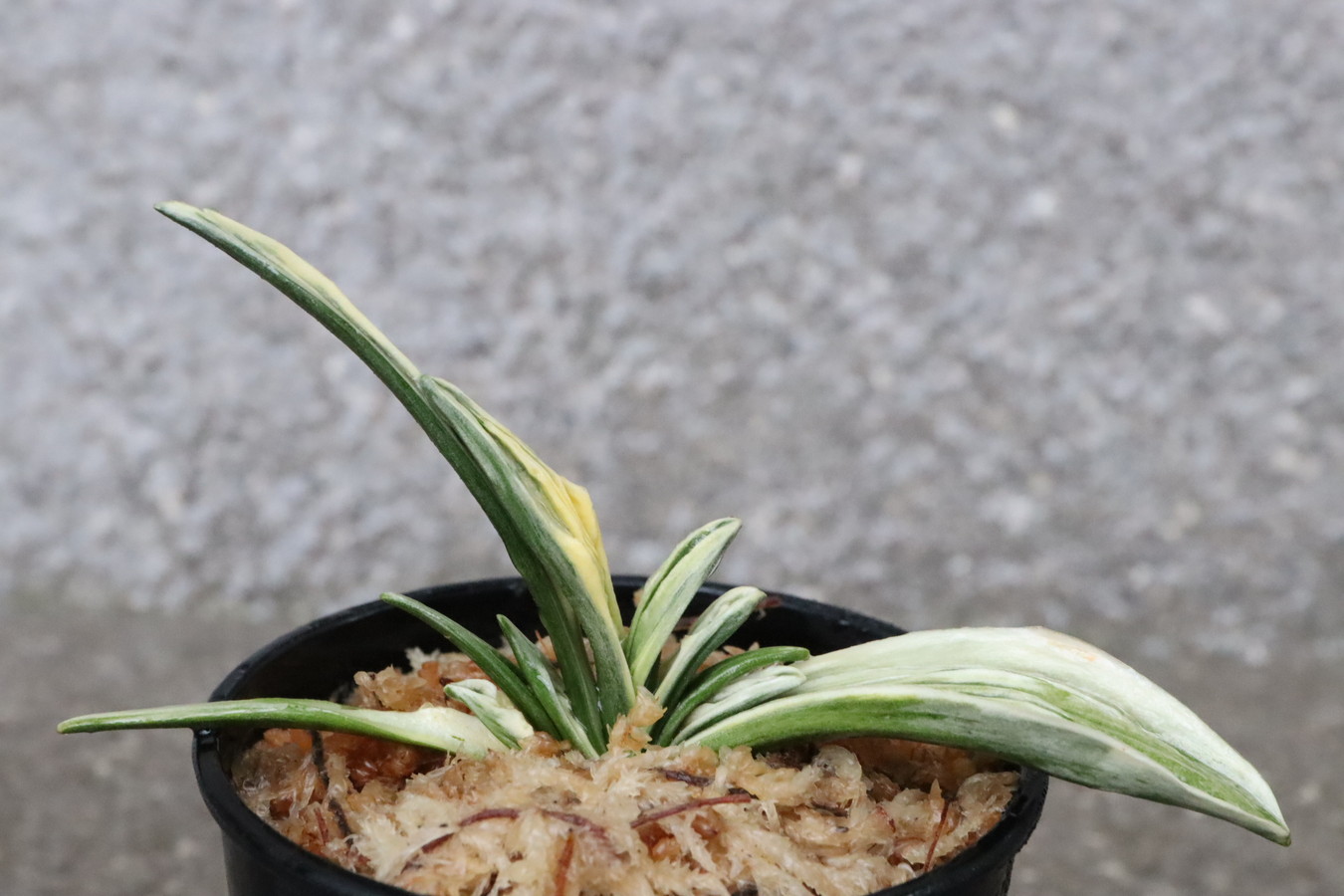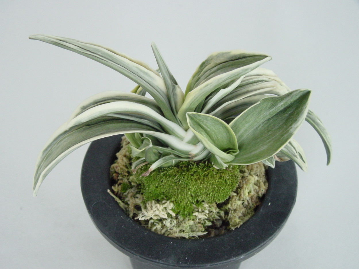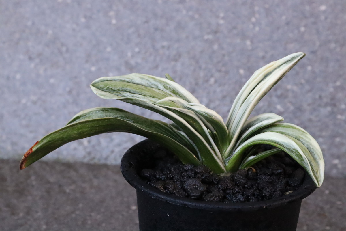 葉長7cm、葉幅3㎝内外の中型種。腰折れが低く、平葉型で、熨斗葉、本剣、棒葉、葉面溢れるばかりの総雅糸竜を見せる。濃紺地に純白の鮮明な覆輪をかける。葉面を純白な糊に覆われた姿は魅力的である。少し芋が柔らかいので、肥料は少なめが良い。子出し良く、繁殖は良い。