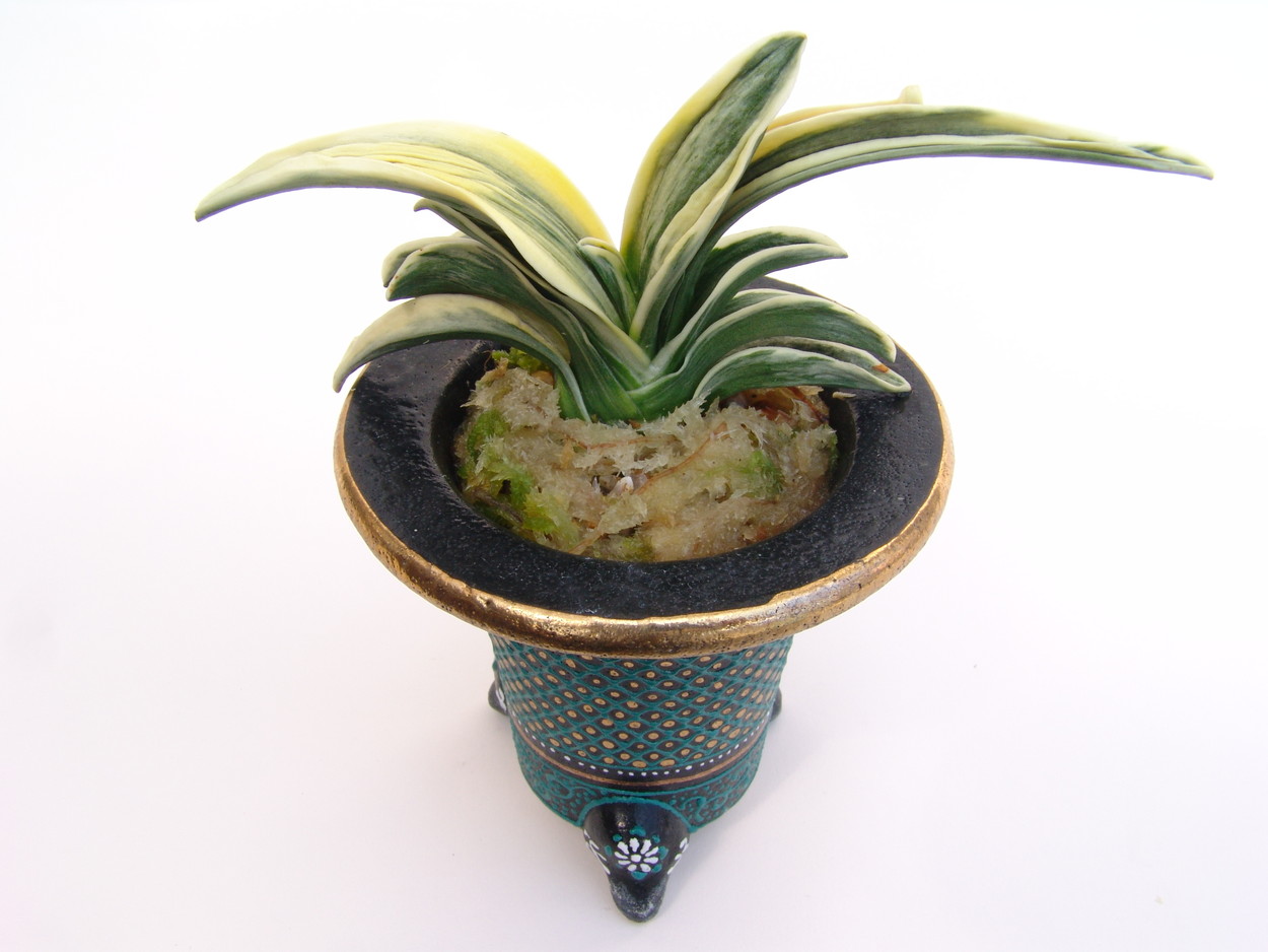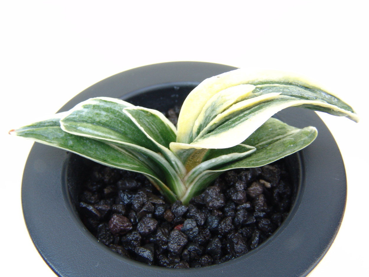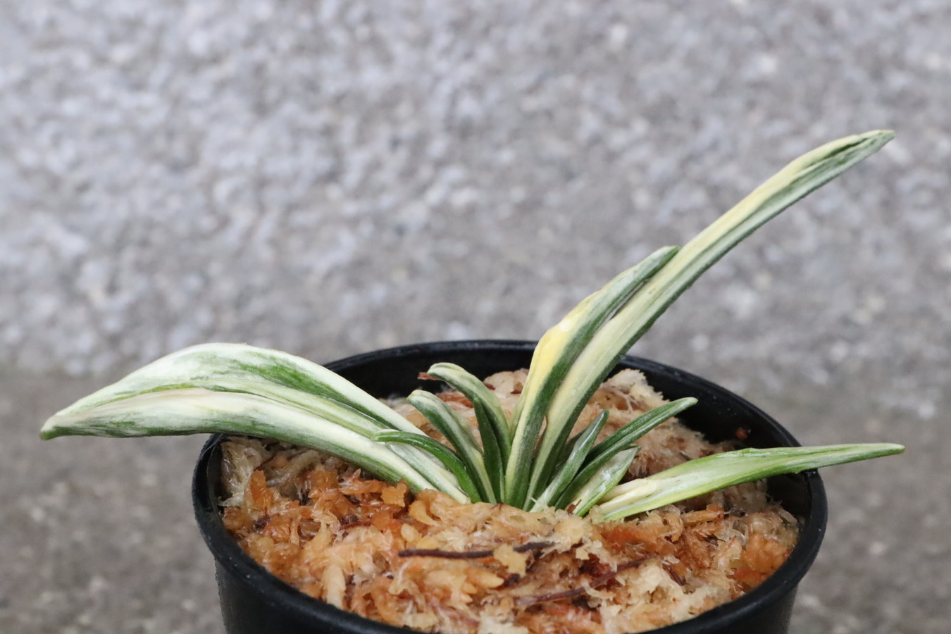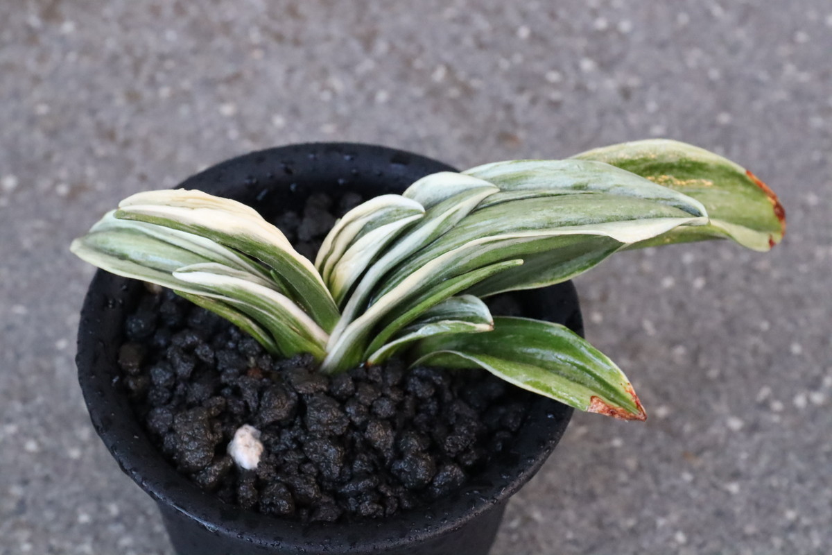葉長7cm、葉幅3㎝内外の中型種。腰折れが低く、平葉型で、熨斗葉、本剣、棒葉、葉面溢れるばかりの総雅糸竜を見せる。濃紺地に純白の鮮明な覆輪をかける。葉面を純白な糊に覆われた姿は魅力的である。少し芋が柔らかいので、肥料は少なめが良い。子出し良く、繁殖は良い。