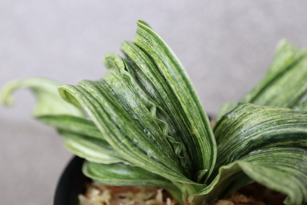 おもとの中でもこれほど美しい獅子は少ない。獅子系統の中では一度は作ってみたい品種。子上良く丈夫です。又実親として芸を移す雄木に使用しても面白い。