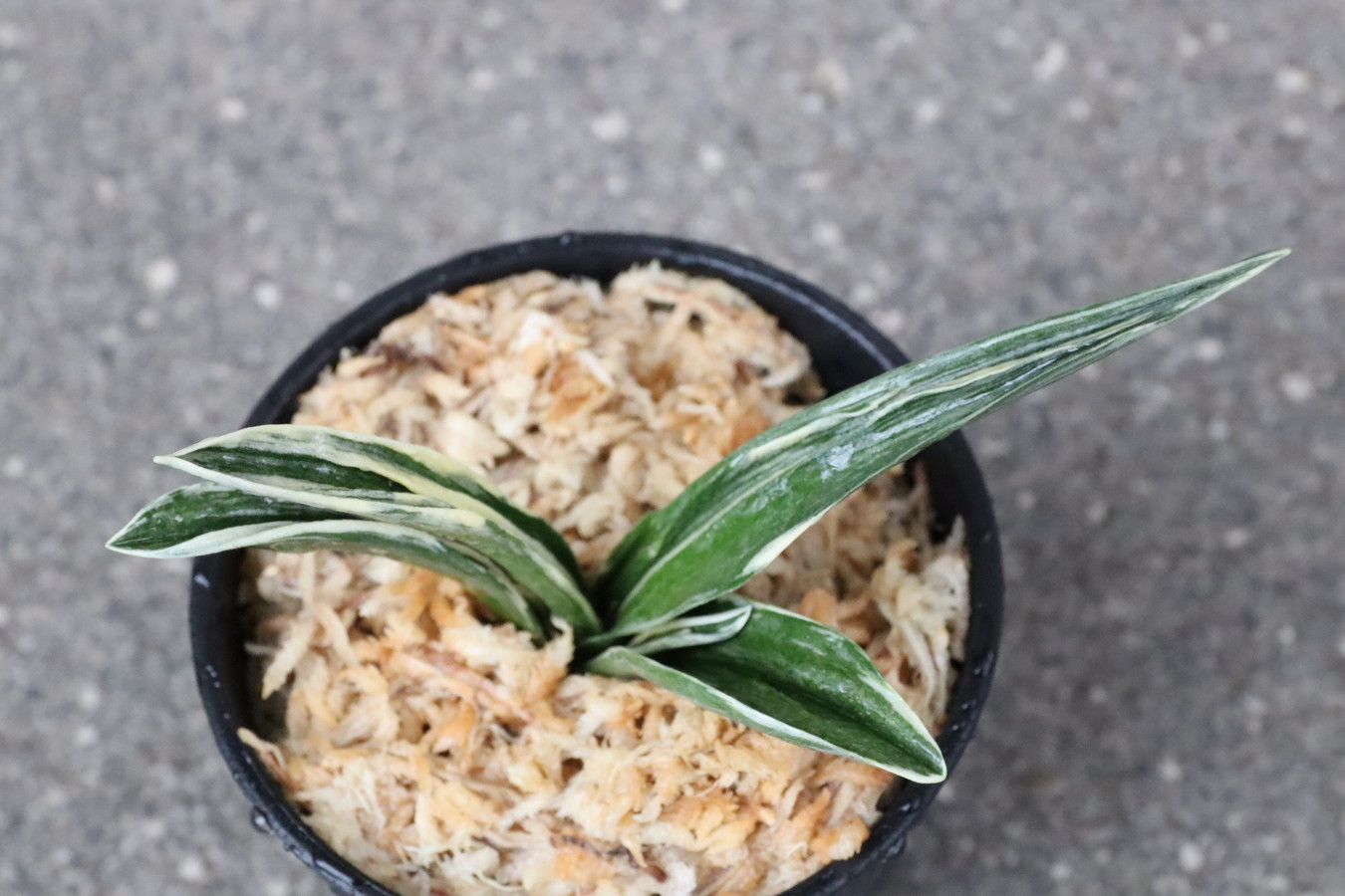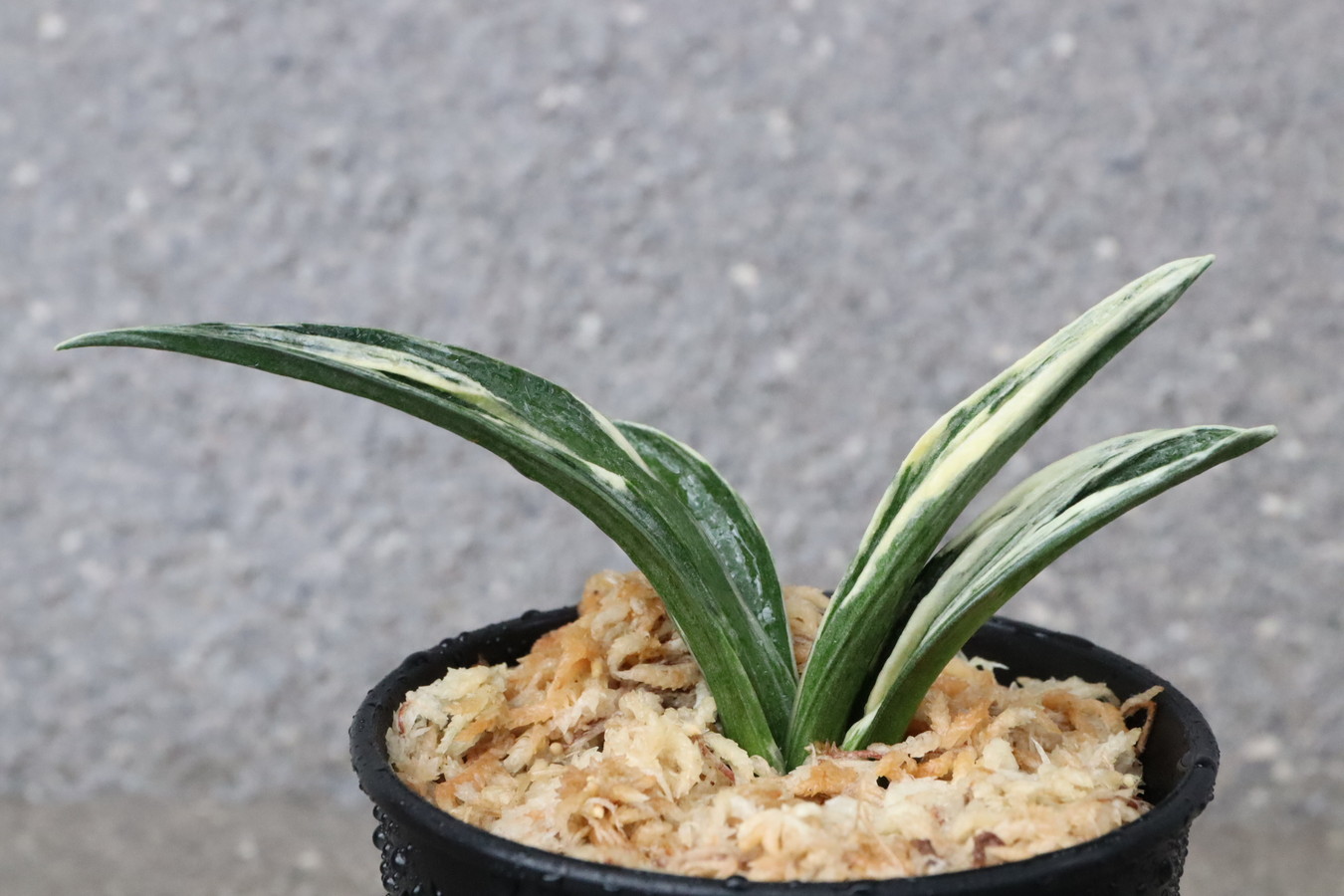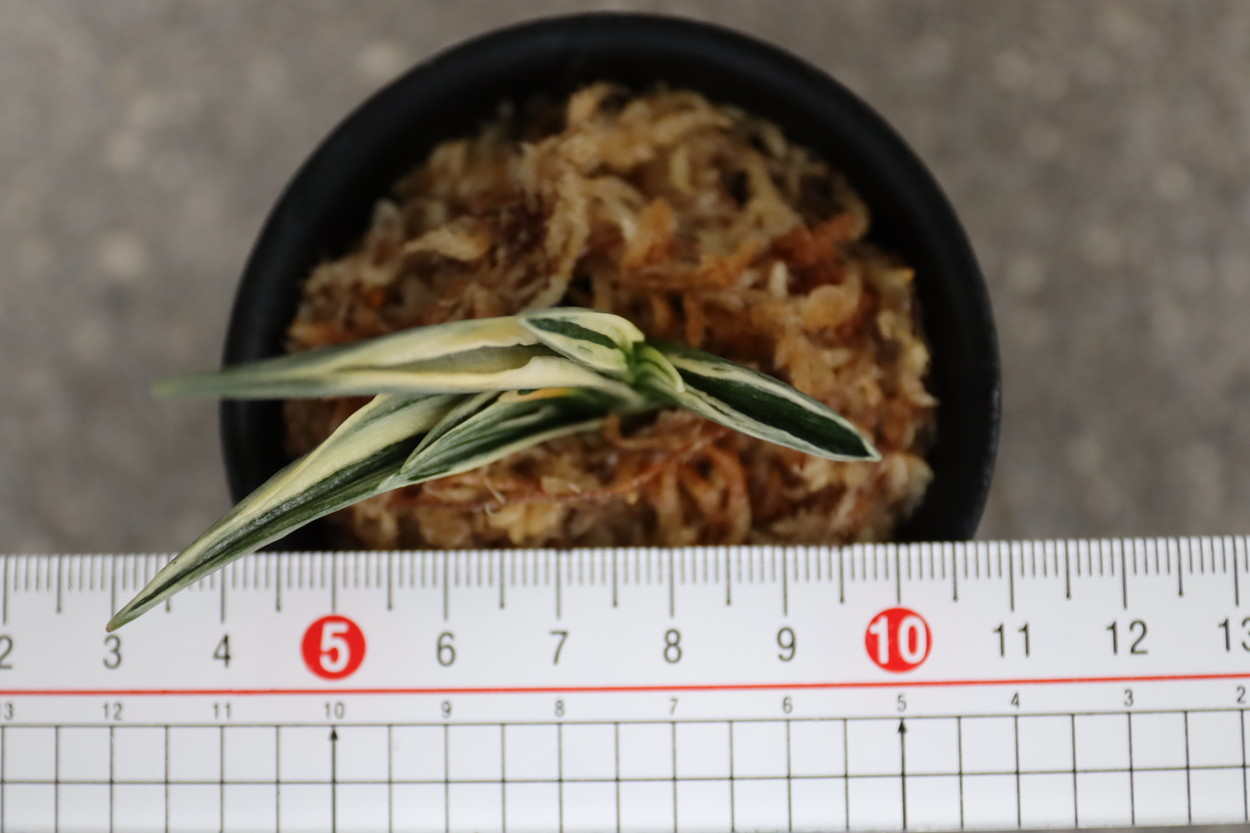 実親『大宝』から生まれた。昭和8年に命名者が譲り受けて命名し盛大な披露宴を催して全国に棚割りされた。葉長4㎝、葉幅2㎝内外の小型種。濃紺緑色の紺地で、葉先は尖って葉肉は厚く、首は太い。雅糸竜、剣葉、鈴虫剣など多芸である。黄色み帯びた覆輪が輝き、襟組みも良く、落ち着いた小型の代表品種。小型だが、至って強健である。