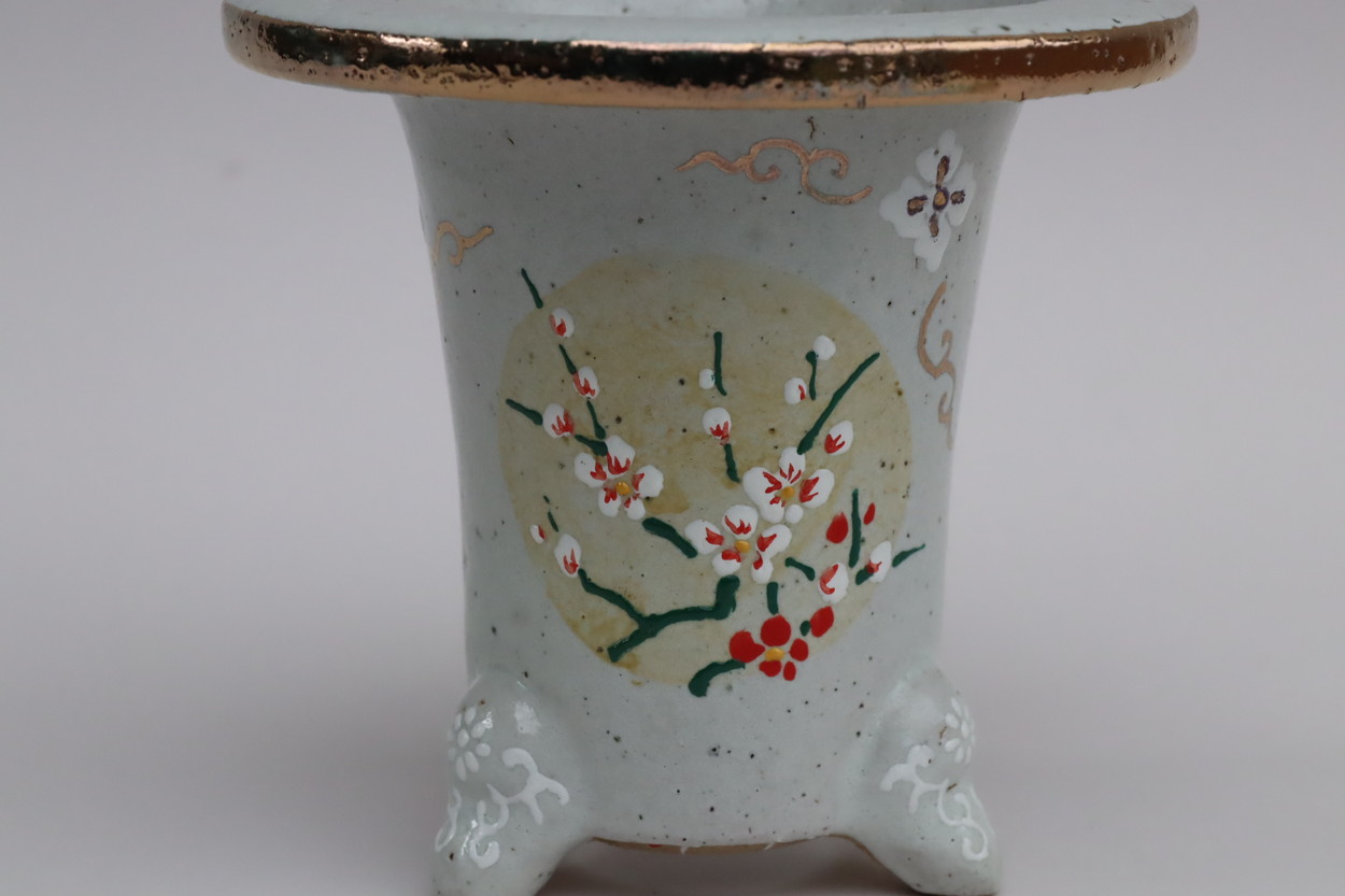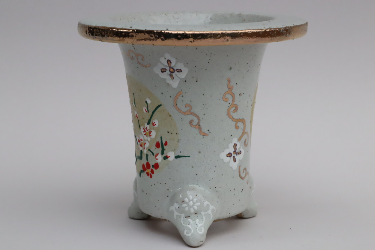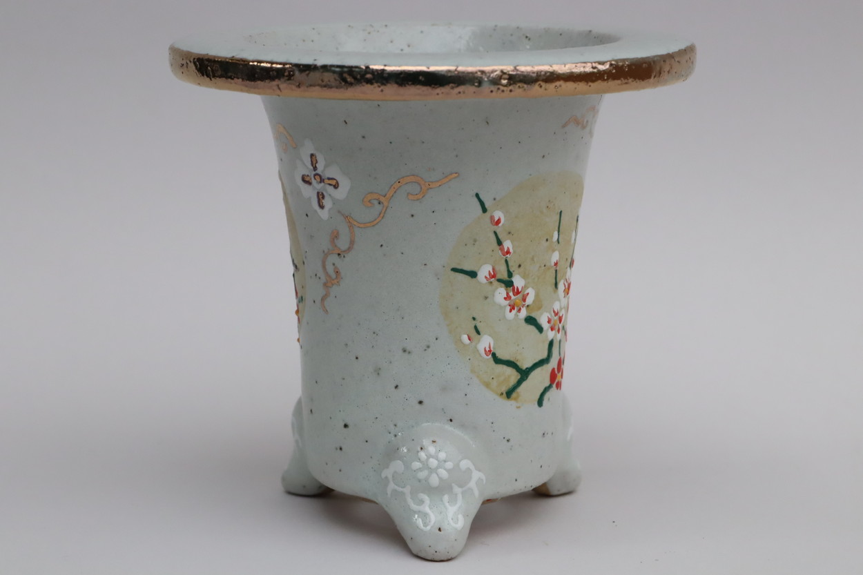 万年青鉢 オモト鉢楽焼は天正年間(約400年前)に始まる日本独特の焼き物です。楽焼は《急熱急冷》という特殊な焼成方法をとります。急熱急冷だから、鉢に細かな 微細な穴ができ、通気を良くしています。