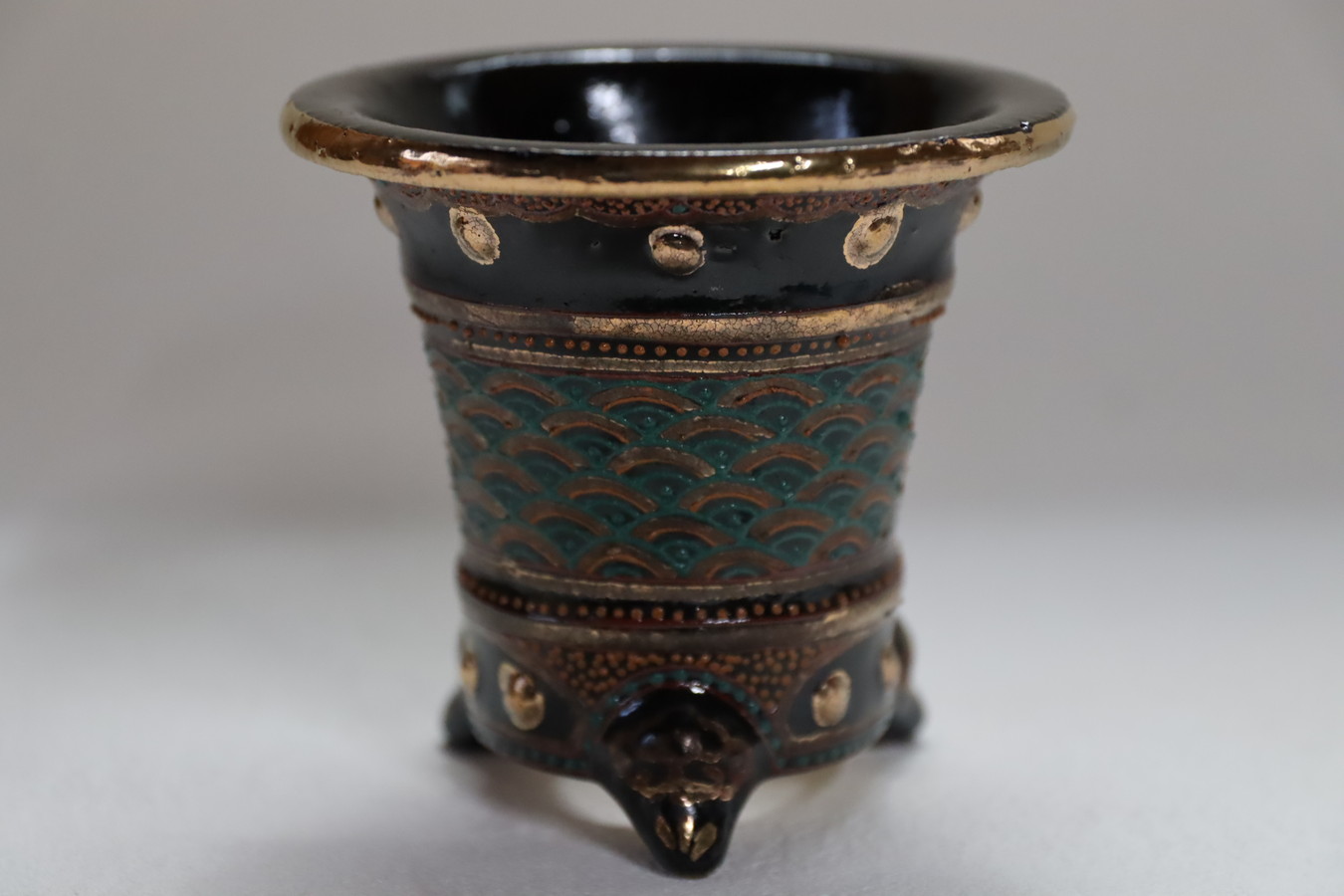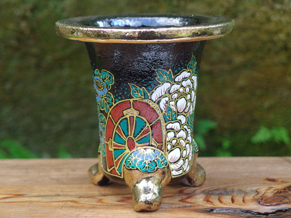 2611,金〆青海波 万年青楽鉢 外径約9.2cm 高さ約8.5cm 華サイン加茂黒 古代鉢 太鼓胴【送料無料】