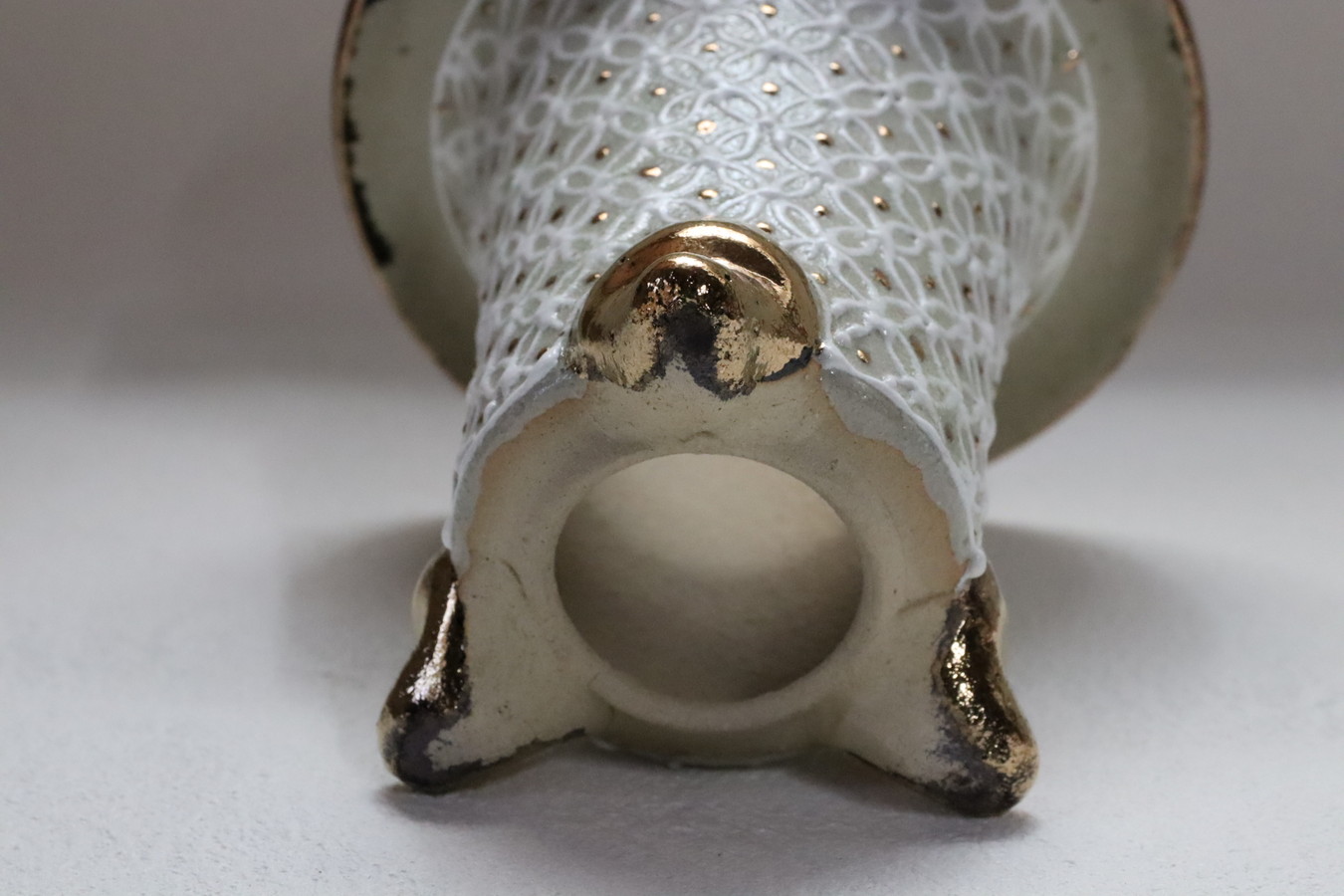 古くから使われるおもと錦鉢の柄。もとは、小さな輪の文様の集まりが、魚の卵を連想させる事から、「七子」「魚子」「斜子」などの字があてられている。古くからある柄のようで、延宝六年(一六七八)の加賀藩の工芸標本『百工比照』の中に、「ななこ」の名称が見られる。また小浜藩の藩医が延宝年間に記した書物にも「魚子塗」の言葉が見える。鉢の柄は渋く、おもとを引き立てる、ということで古くから愛され、使われてきた。単純な柄ゆえ、その作家さんの技量もでて、素晴らしい物は古いものはもちろん、新しい物も価値が高い。格子の中の点である、金の絵具は、絵付けの時は黒く、地の鉢も黒鉢で、必ずといっていいほど目残しがある。手間も非常にかかる鉢でもある。