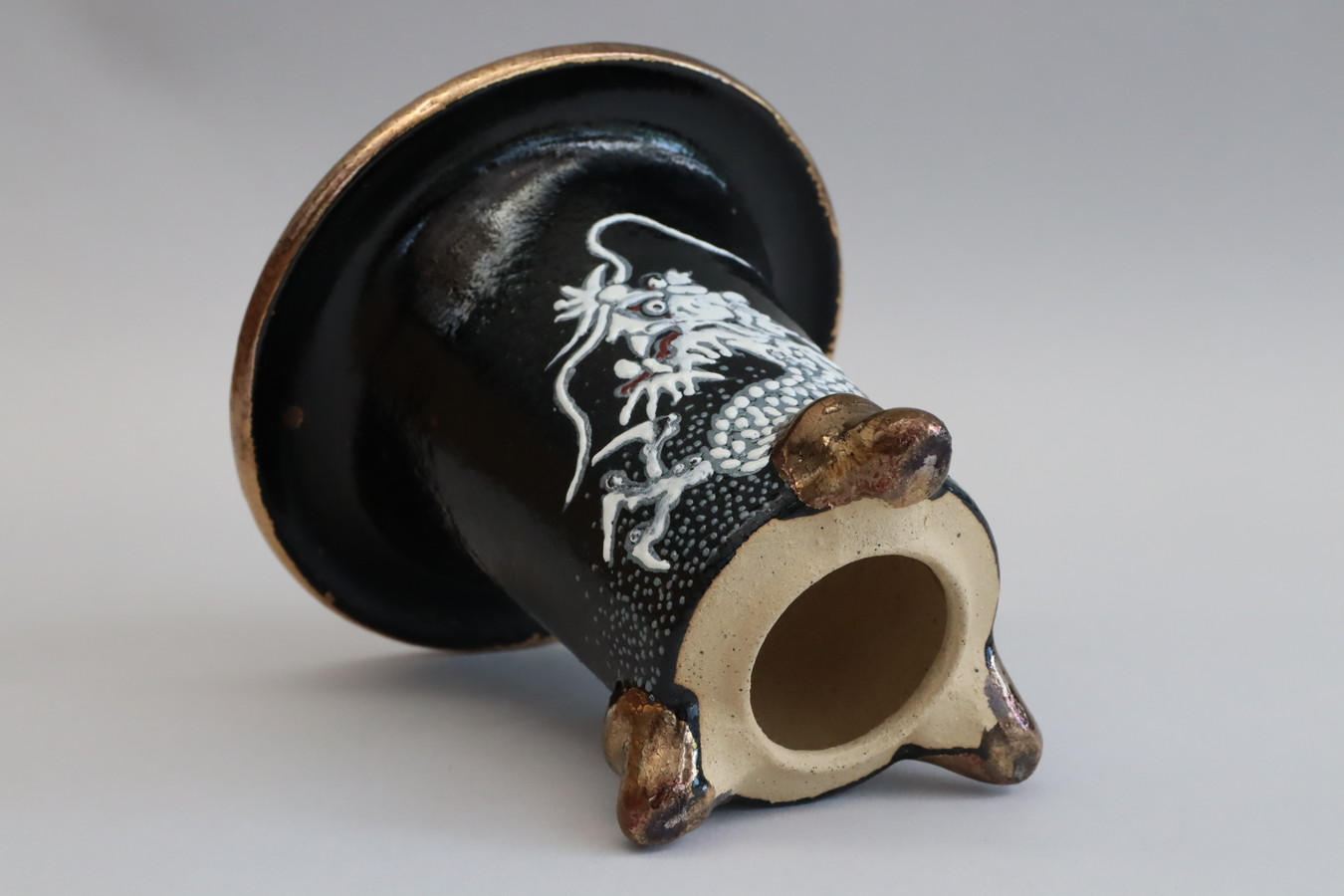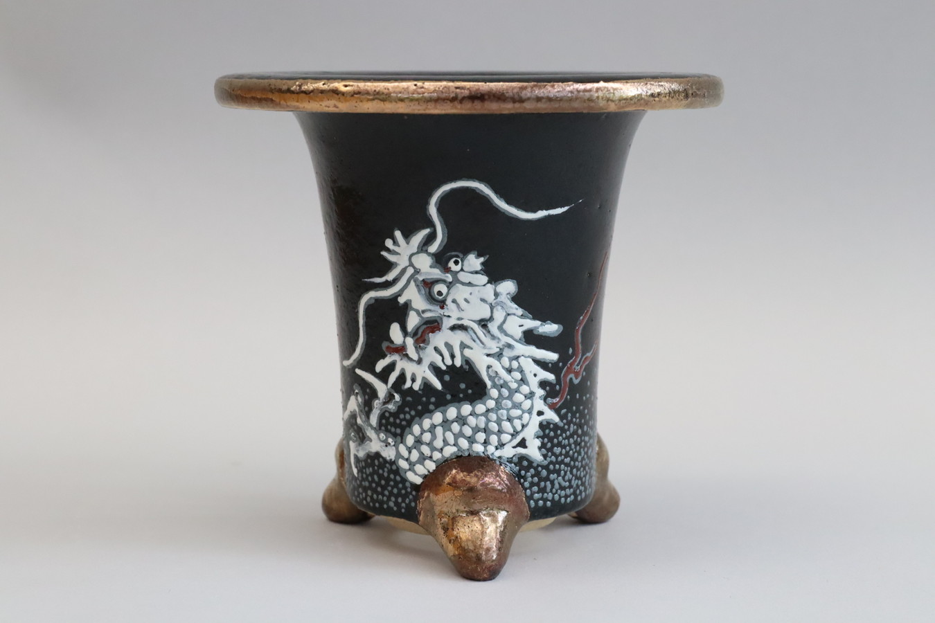 2627,黒地白龍 萬年青楽鉢 外径約10.8cm 作よい