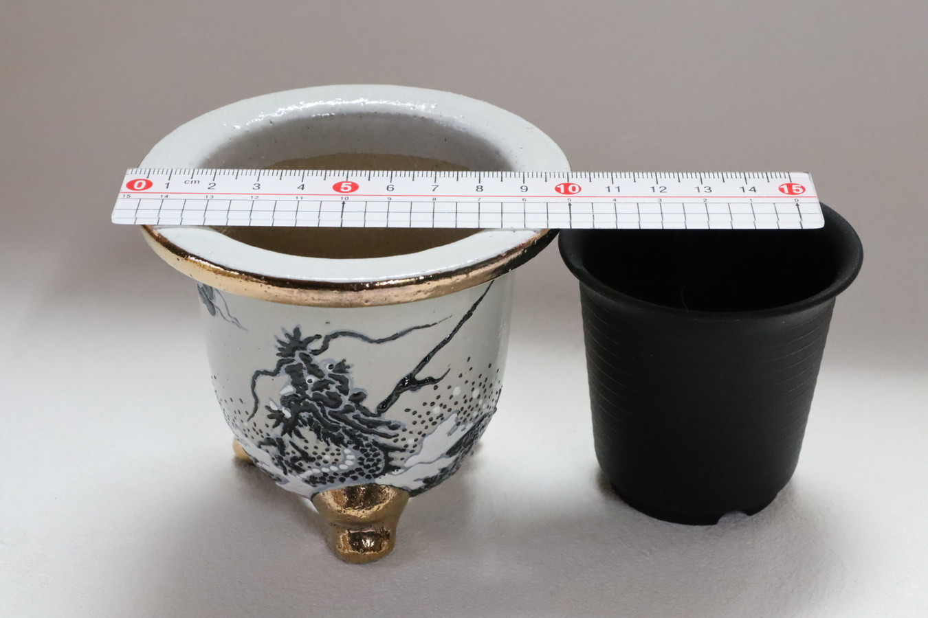 代々お付き合いのある窯元と試作を重ねてきましたが、焼き物の特性上、寸法は土、季節、その日の天気、湿度によっても変わり、自然に大きく左右されます。本当に腕がある作家さんがやってもこの寸法は時の運で、普段の鉢製作と比べてもロスは大幅に出てきます。それでも、この錦鉢で万年青を楽しむのは徳川家康公が万年青を楽しむ以前からと言われています。そんな日本の万年青の楽しみを是非多くの人に味わっていただきたく、なんとかここまで漕ぎ着けました。手に取っていただいて、万年青と錦鉢を楽しんでください。