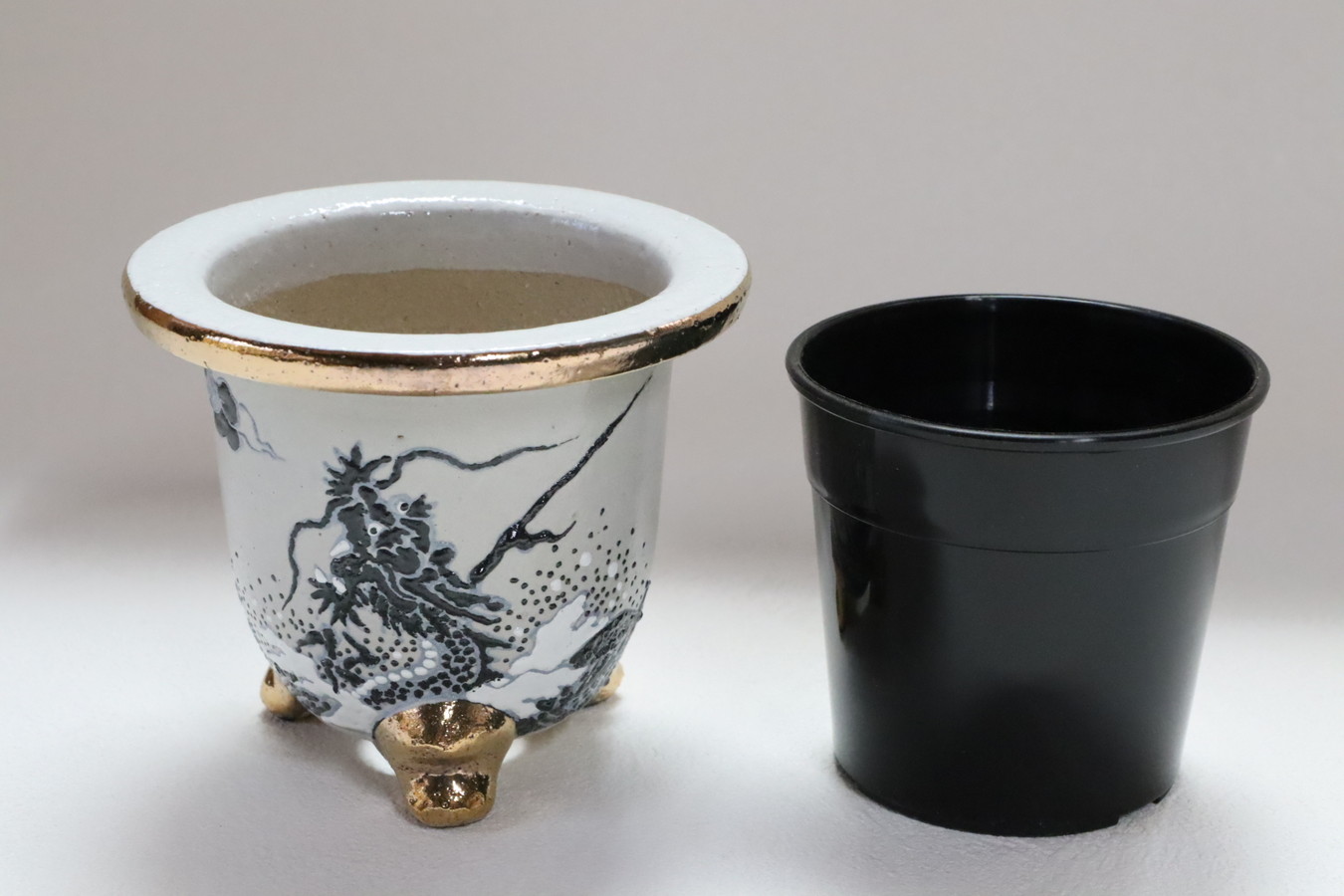 また、このプラ鉢とこの錦鉢の組み合わせなら、どの錦鉢でも入るので、今日は運気を上げたいから龍、夫婦仲良く鶴、落ち着いた水墨画を眺める、良いことが常に訪れる青海波と錦鉢で気分を変えていけます。