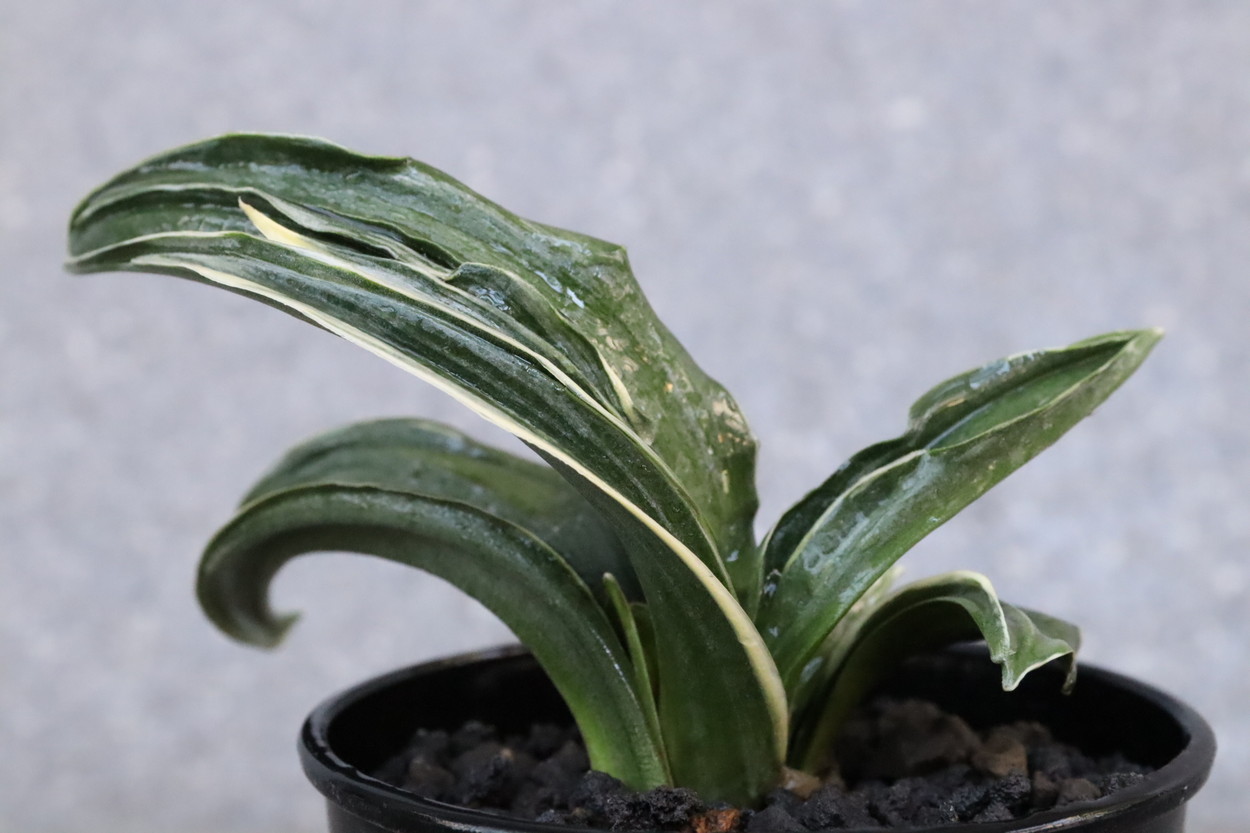 厚みと、堅さのある濃緑色の葉に覆輪、甲竜、熨斗葉を現す入門品。時に雅糸竜もみせる。親木になっても紺性を強く残すことで、特に丈夫な中型種。葉はどれも全く違った変化のある芸をみせ、作る人それぞれのユニークな完成木となる。採光、肥料も強く、芋吹きが主。子上げもし殖えも良い。初心者がまず手にする羅紗品種。