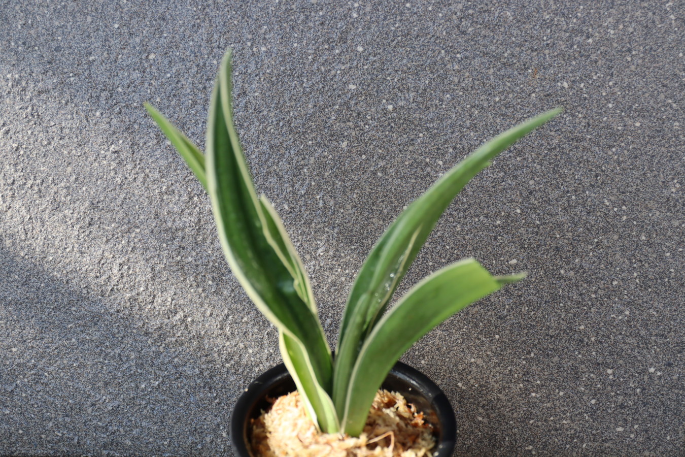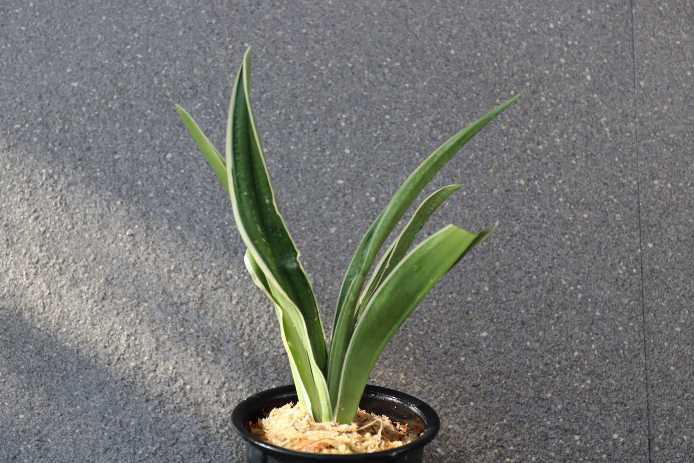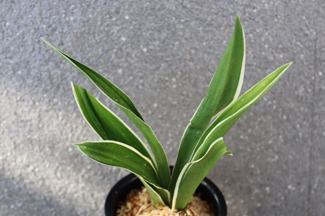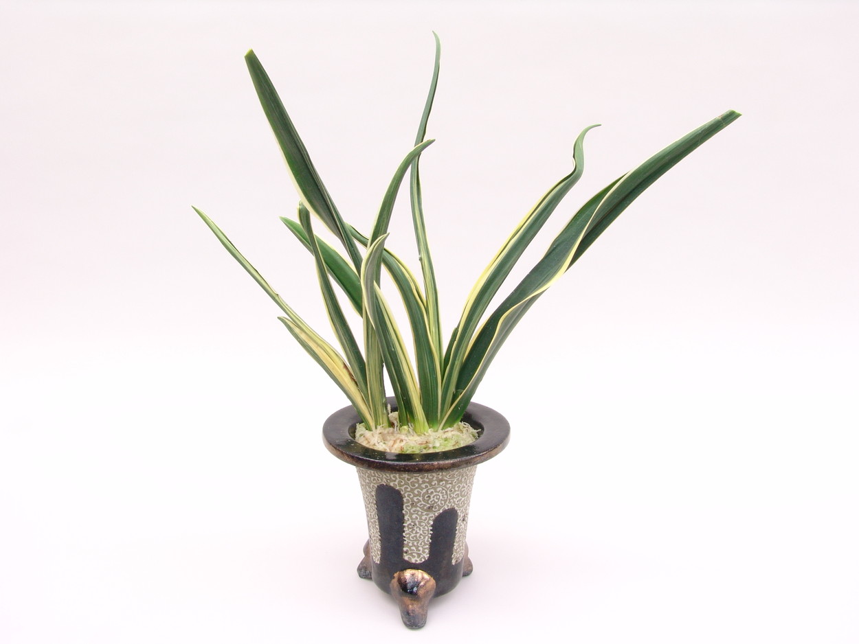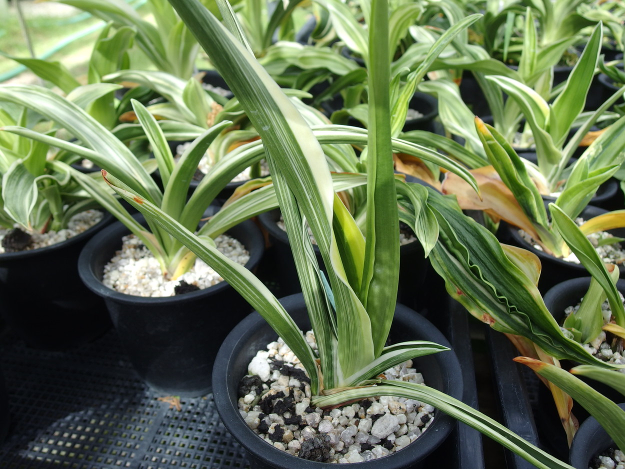 濃緑色で立ち葉性、葉長20㎝、葉幅4cm内外、若い1~5年の内は白覆輪だけ見せます。年がたつに従って棒状の立ち葉となり、葉の裏側に櫛ですいたような白い緻密な総雅糸竜を現し独特の葉姿を見せる。育て方でも葉芸を早くすることがあるが、まだよくわかっていない。