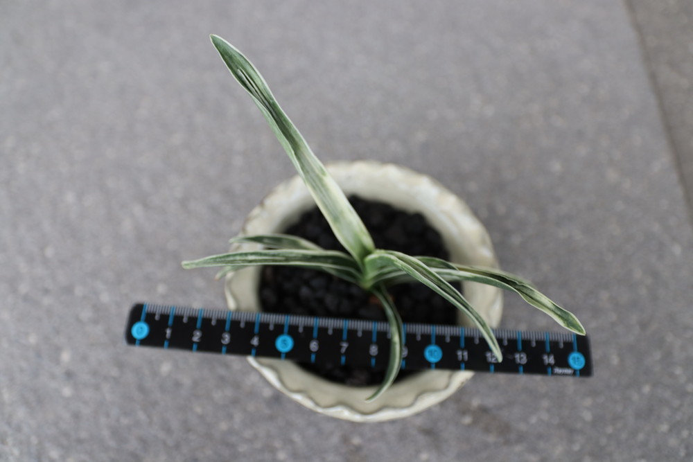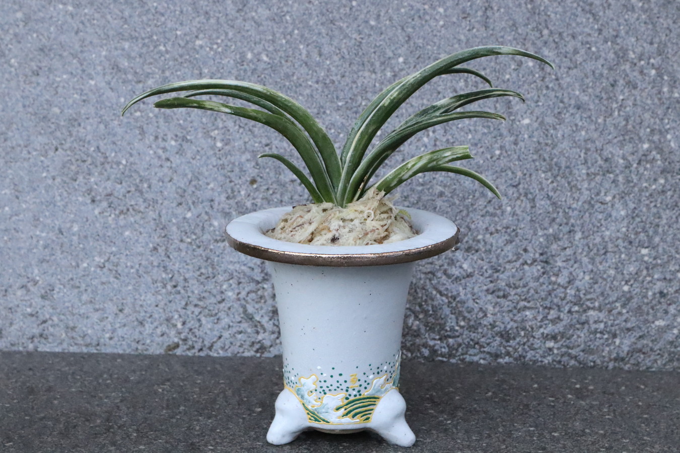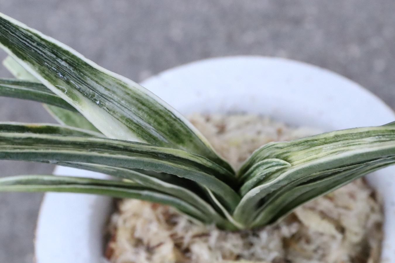 縞甲竜系の中では小型種。『雪渓錦』の芽変わり。濃紺緑色の葉は地合い良く、樋葉となって雅糸竜を現す原木の『雪渓錦』が、栽培中に根変わりして雪白の矢筈斑が出現したもの。根変わりしたためか、原木に比べて小型となり、葉姿も変化して全く違う姿となる。性質は至って強く、矢筈虎を鮮明に現すためにも、施肥・採光・通風は他の品種に比べて強めにする。繁殖は旺盛で作り易く、入門者にも大変楽しめる品種である。