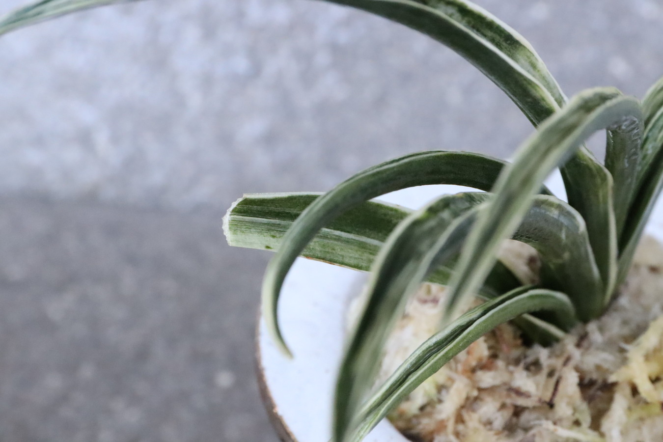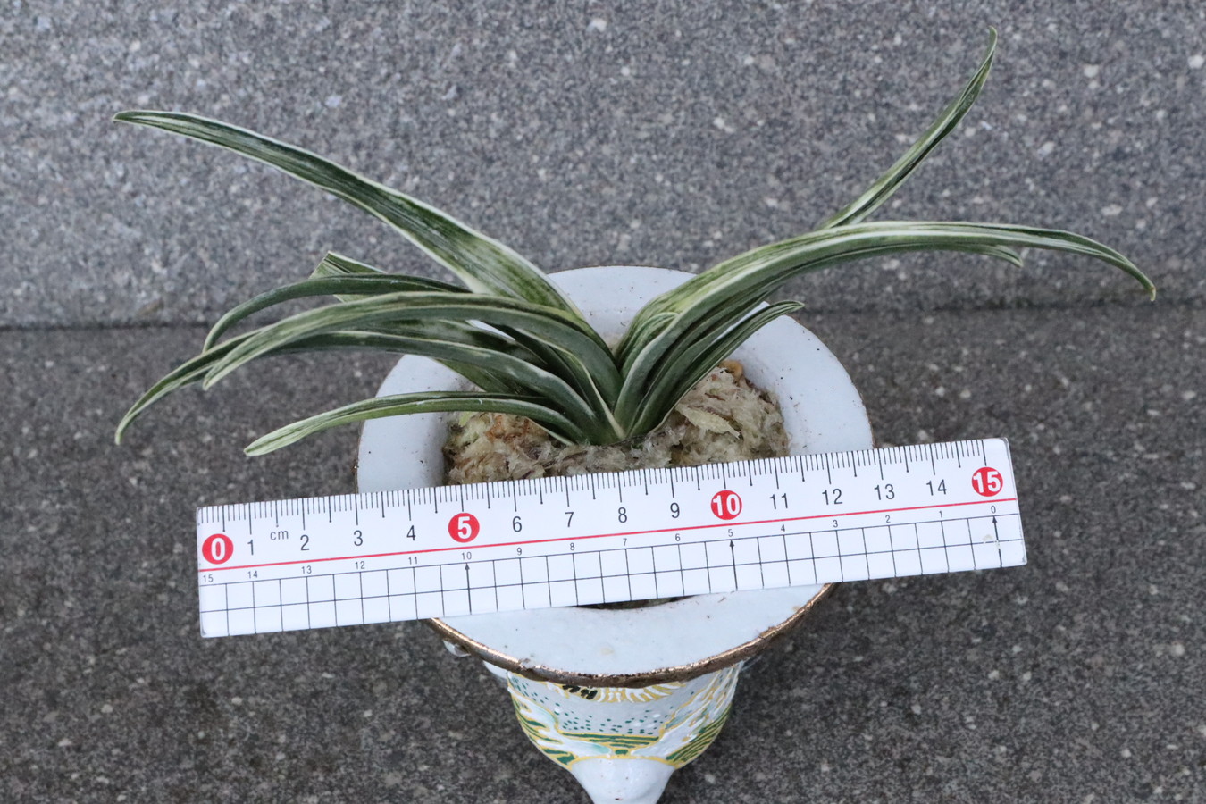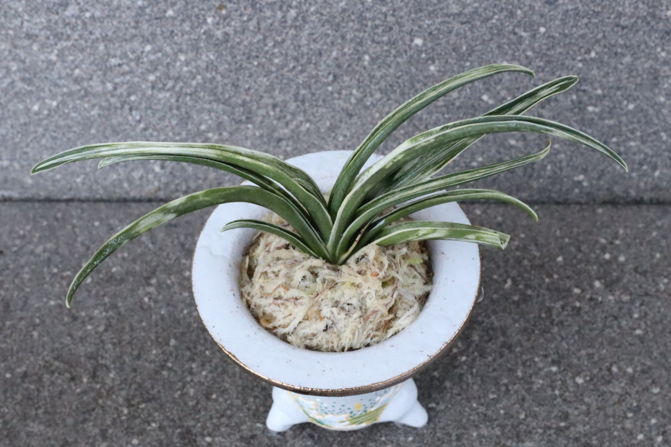 縞甲竜系の中では小型種。『雪渓錦』の芽変わり。濃紺緑色の葉は地合い良く、樋葉となって雅糸竜を現す原木の『雪渓錦』が、栽培中に根変わりして雪白の矢筈斑が出現したもの。根変わりしたためか、原木に比べて小型となり、葉姿も変化して全く違う姿となる。性質は至って強く、矢筈虎を鮮明に現すためにも、施肥・採光・通風は他の品種に比べて強めにする。繁殖は旺盛で作り易く、入門者にも大変楽しめる品種である。