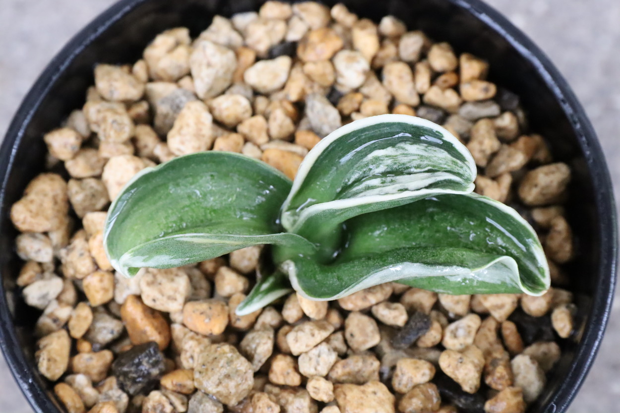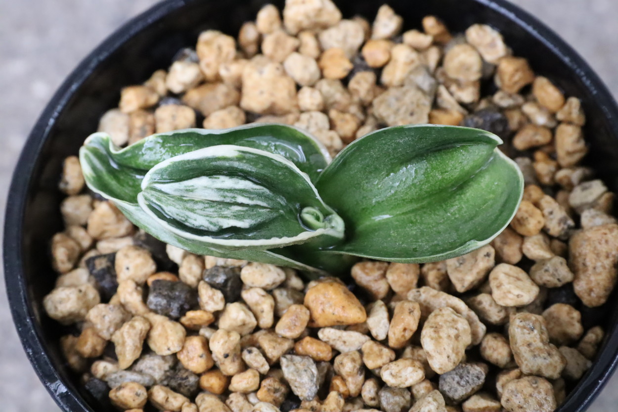 この品種の魅力は、「力和」でしか味わえない芸、丸葉の可愛らしい姿、その変化と、たくさんあります。杉山力蔵氏と岡田和吉氏が共有したため、『力和実生』と呼ばれ親しまれてました。昭和48年に待望の覆輪が完成。実生時代から常に人気で、三河地方では当時100万円以上(300万、500万)の値が付いて、俺が買う、いや俺が、という喧嘩するほどの奪い合いだったそうです(豊明園2代目談)。