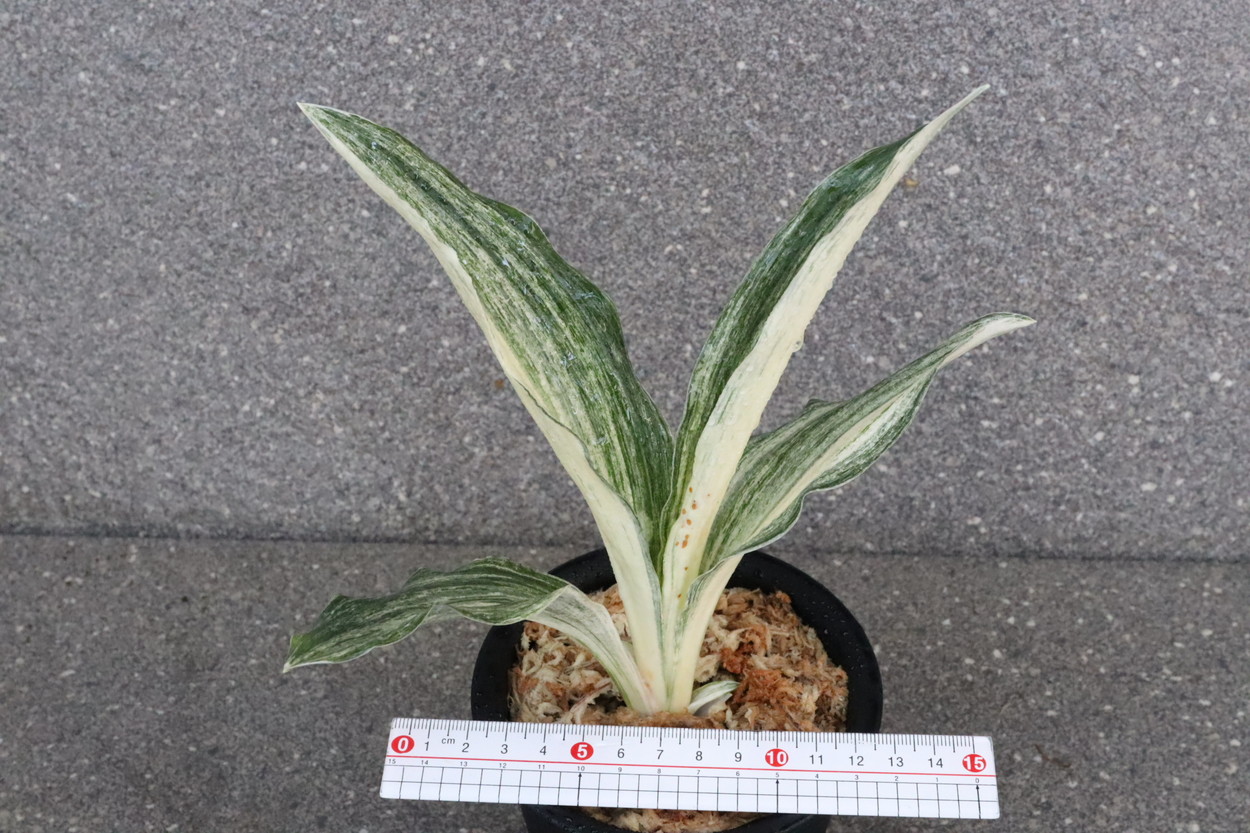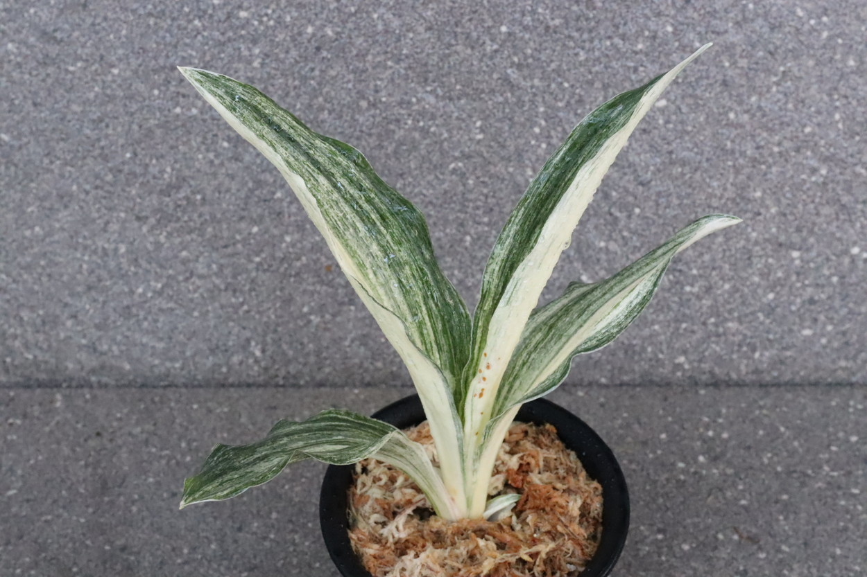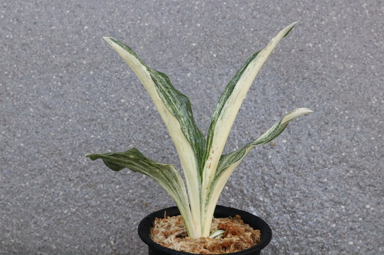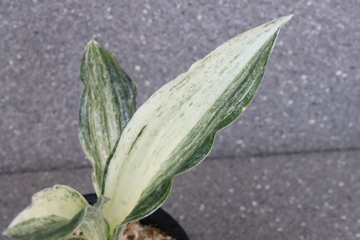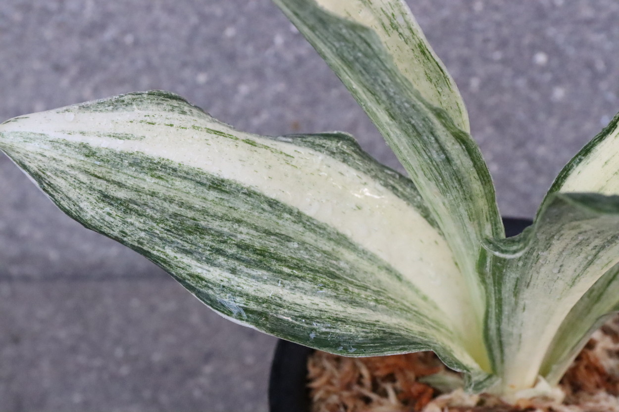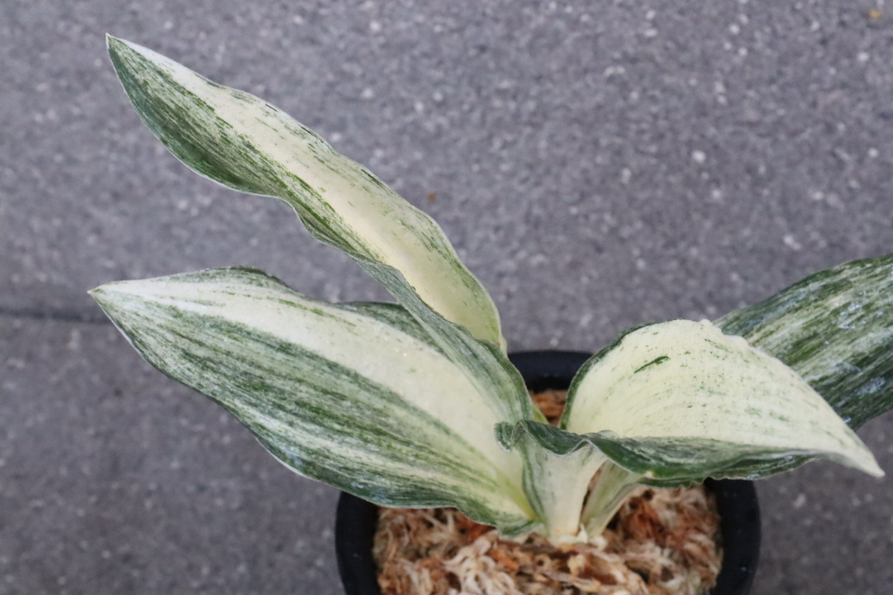 広い葉巾に白斑を見せる、清々しく雄大な品種。