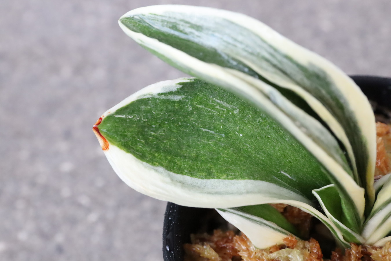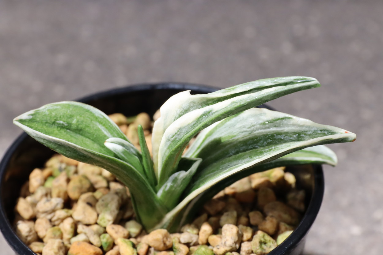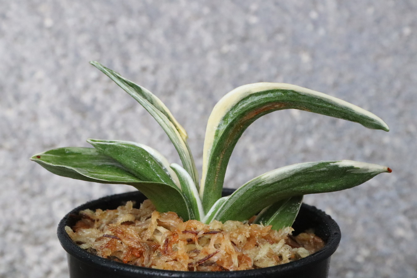 葉長7cm、葉幅3㎝内外の中型種。腰折れが低く、平葉型で、熨斗葉、本剣、棒葉、葉面溢れるばかりの総雅糸竜を見せる。濃紺地に純白の鮮明な覆輪をかける。葉面を純白な糊に覆われた姿は魅力的である。少し芋が柔らかいので、肥料は少なめが良い。子出し良く、繁殖は良い。