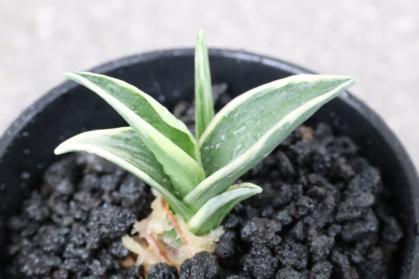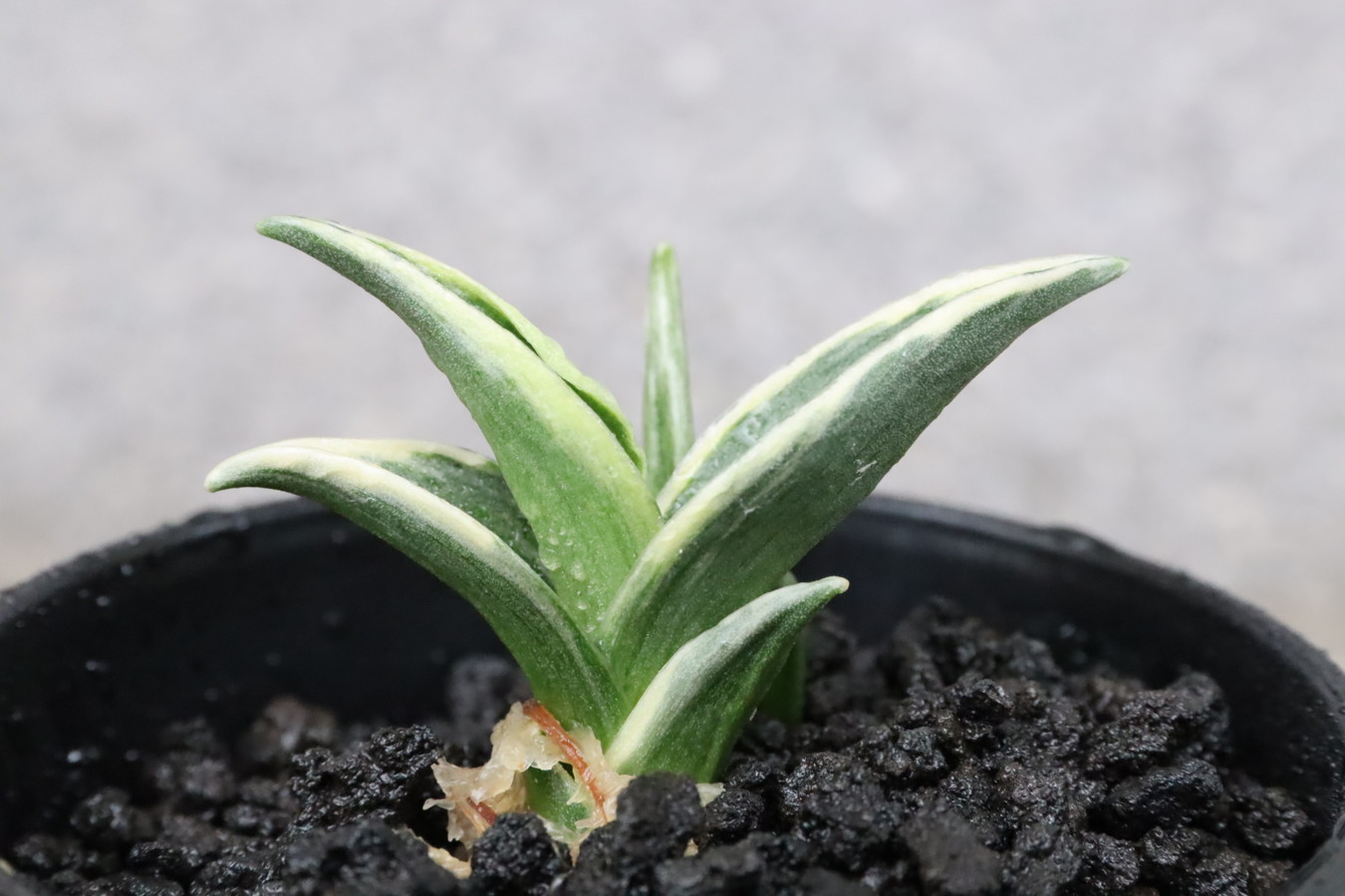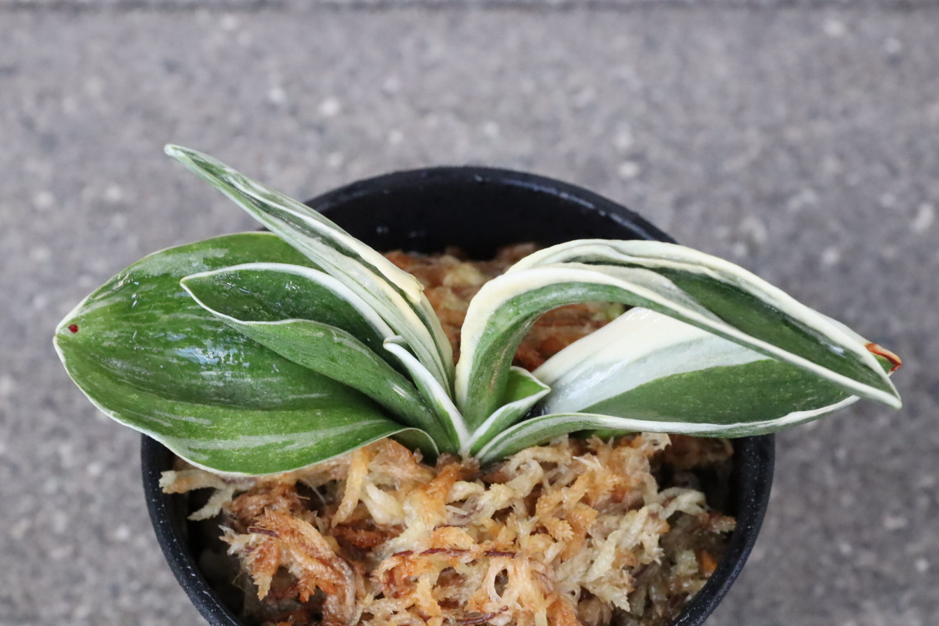 葉長7cm、葉幅3㎝内外の中型種。腰折れが低く、平葉型で、熨斗葉、本剣、棒葉、葉面溢れるばかりの総雅糸竜を見せる。濃紺地に純白の鮮明な覆輪をかける。葉面を純白な糊に覆われた姿は魅力的である。少し芋が柔らかいので、肥料は少なめが良い。子出し良く、繁殖は良い。