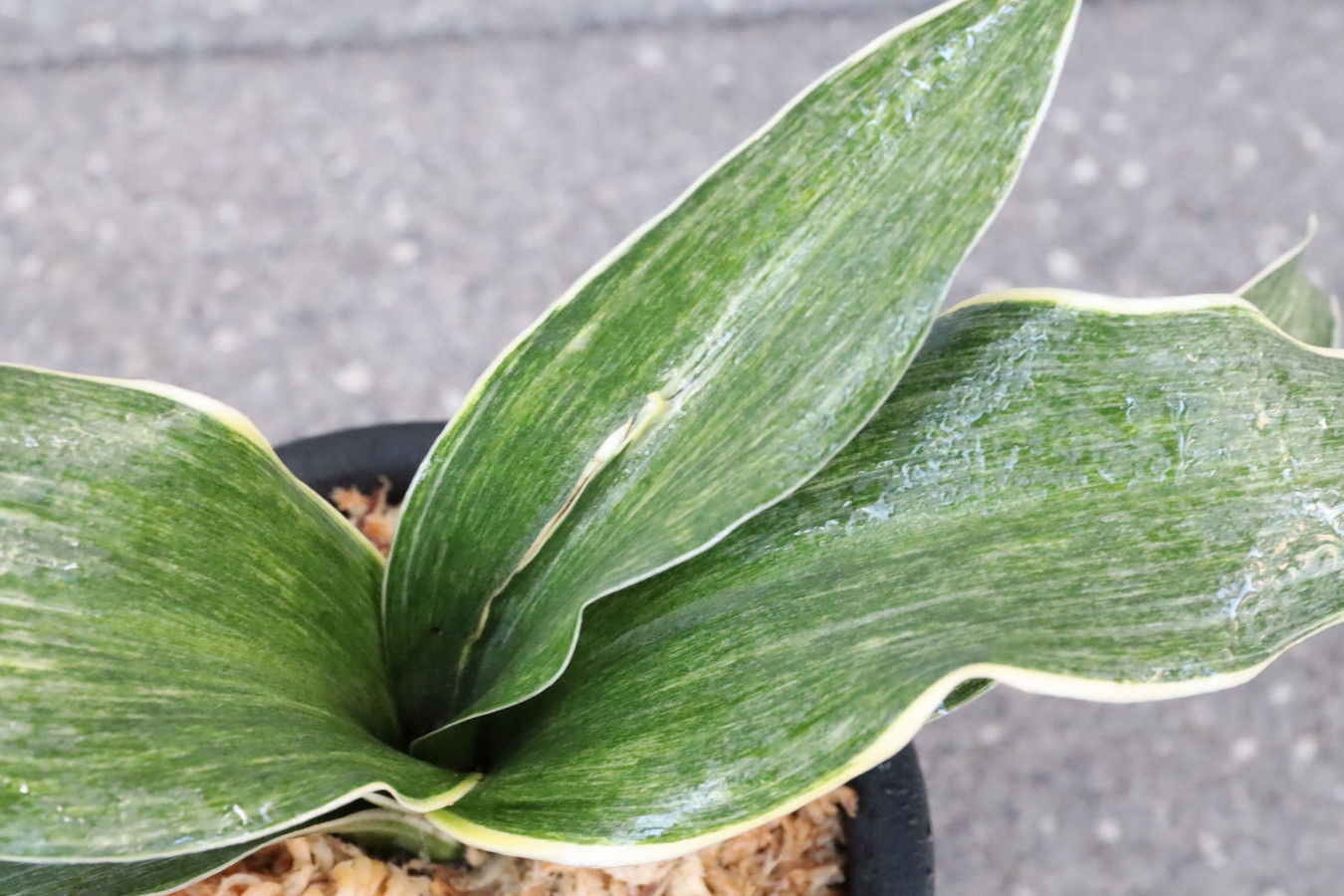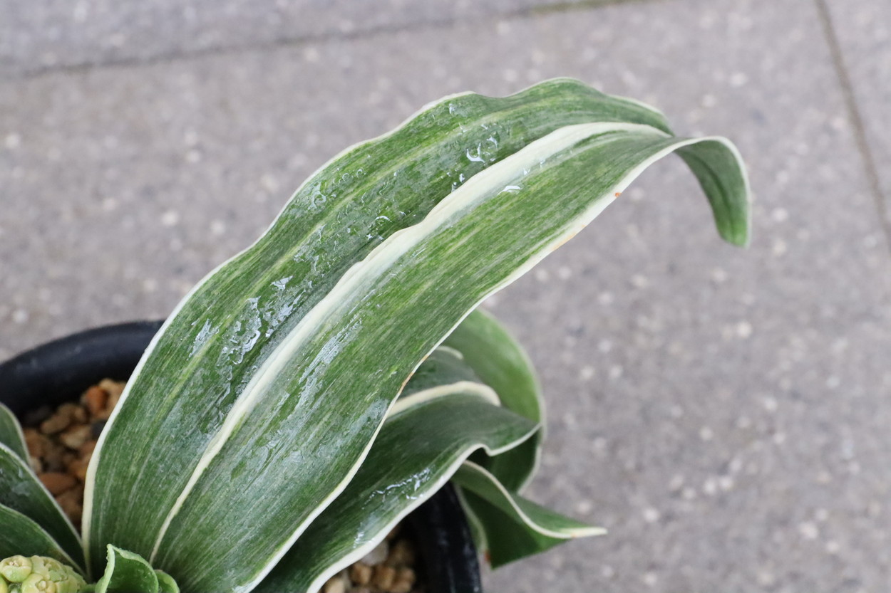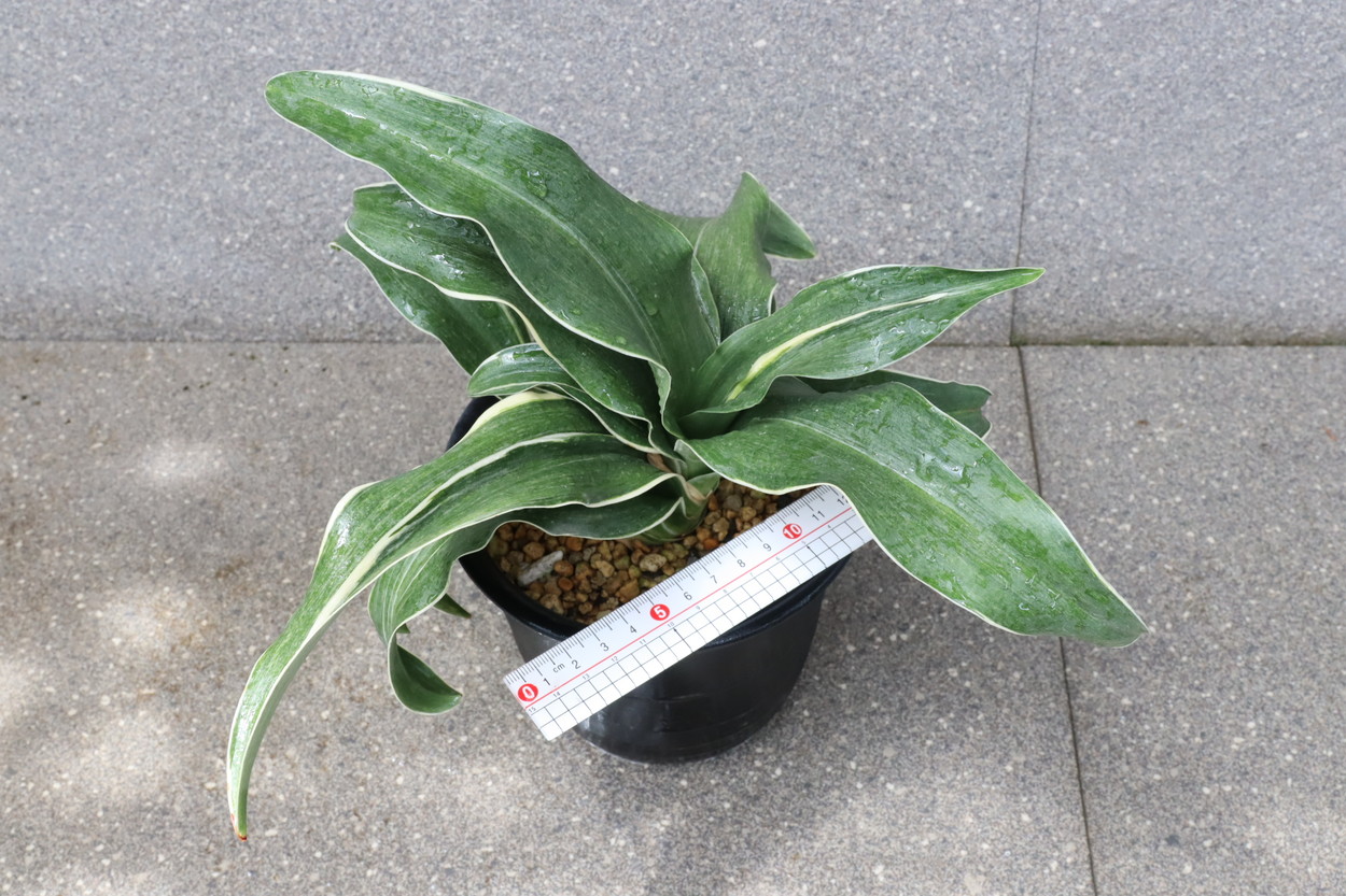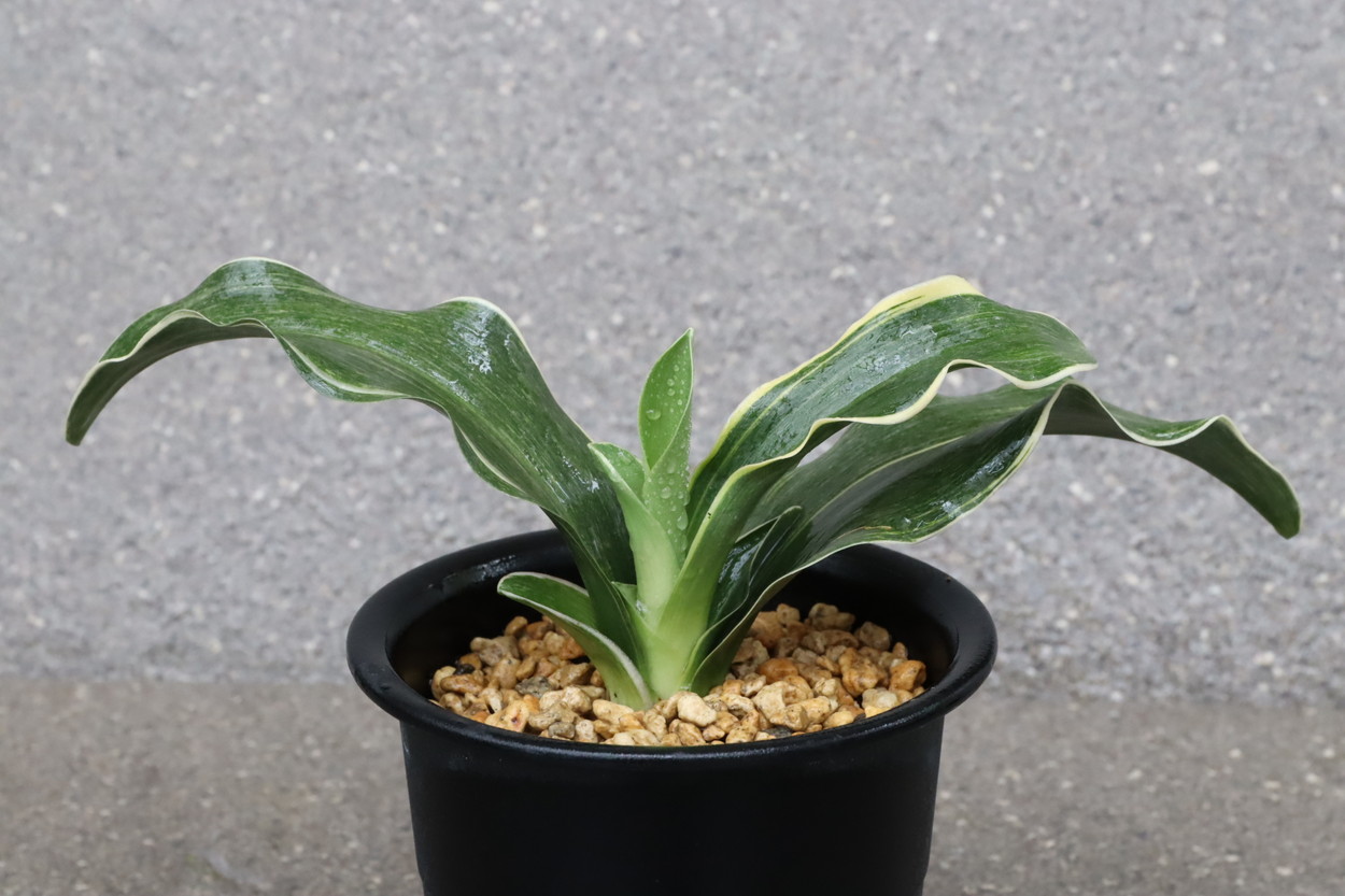 葉先は少し丸く一本竜を見せます、波打つ葉に胡麻斑を現す品種。性質は強健で繁殖も良い。胡麻斑の鮮明なものは「桑名性」という。