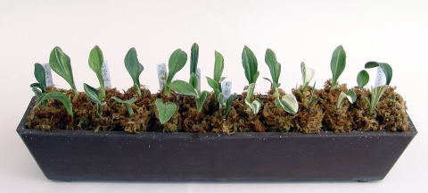 中古苗鉢(長鉢)の代表サイズ 上側巾約 46㎝×7㎝ 下側巾約 42.5㎝×5㎝ 高さ9㎝ 一昔前に作られていた常滑焼の鉢で実生や芋吹きを大量に管理するのに重宝します。