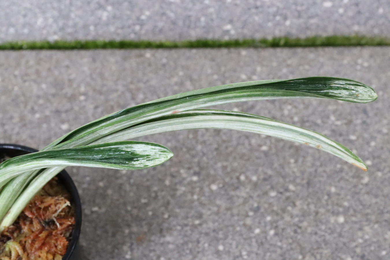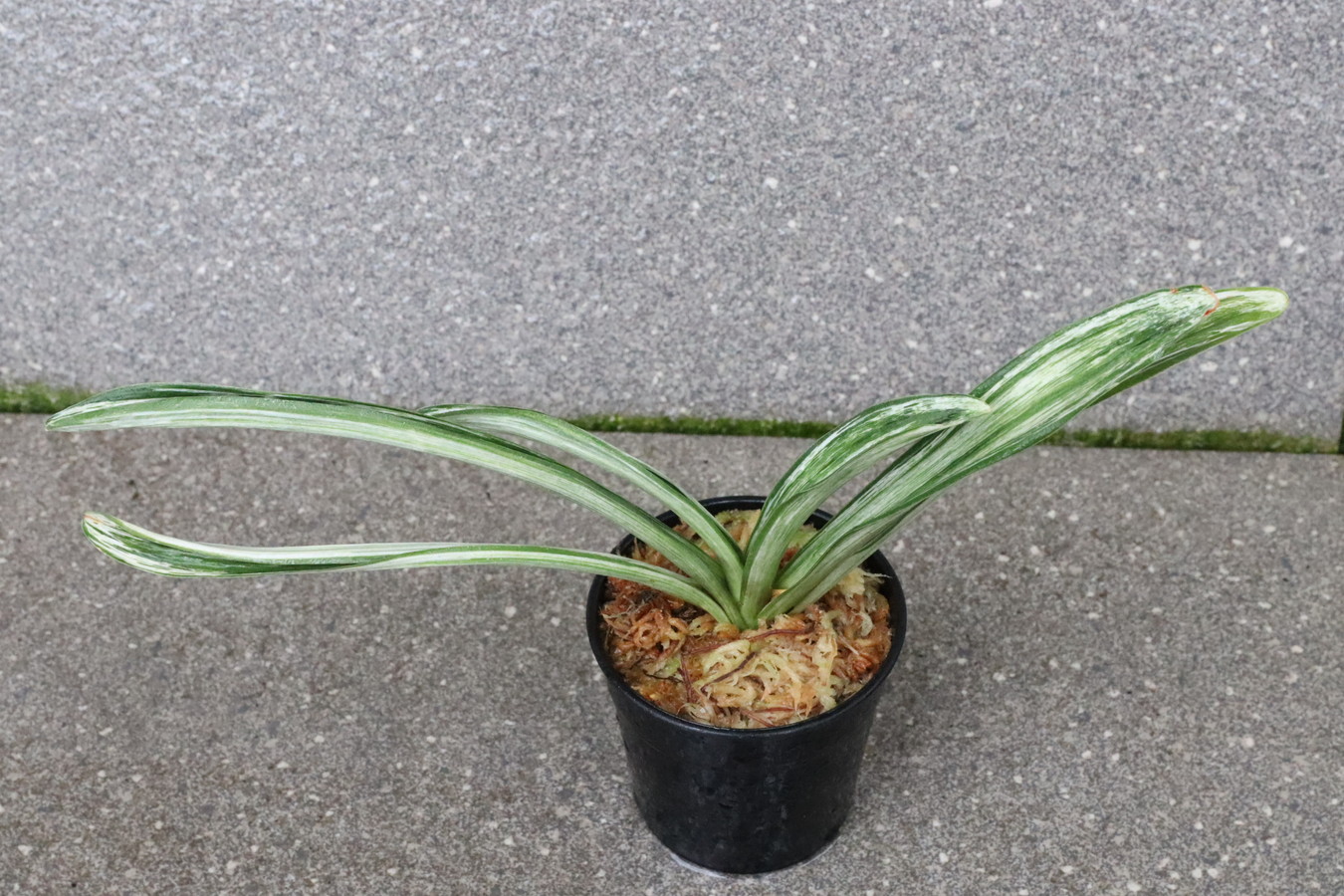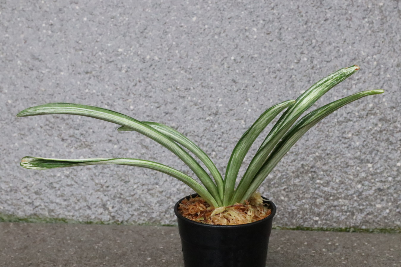 葉長20㎝、葉幅2㎝内外濃紺緑色の覆輪 葉の全面を千代田斑が覆い。雅糸龍・玉龍を見せる。葉先はとがり、採光を強くして栽培すると葉巾は広くなり見ごたえのある姿を見せる。子上の良い品種性質も強いい採光 強~中施肥 強~中繁殖 普通 葉繰り 親になると普通 4~5枚