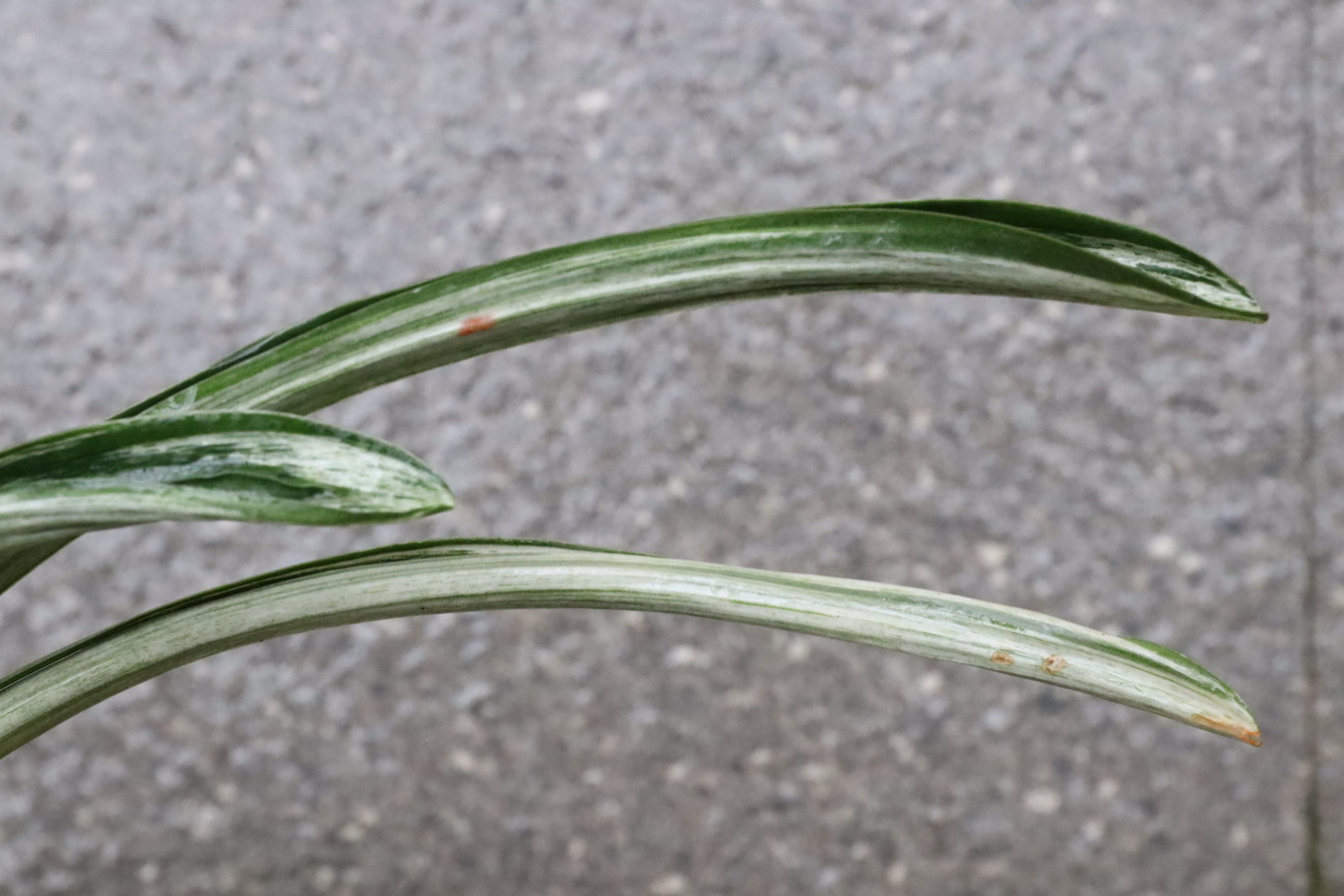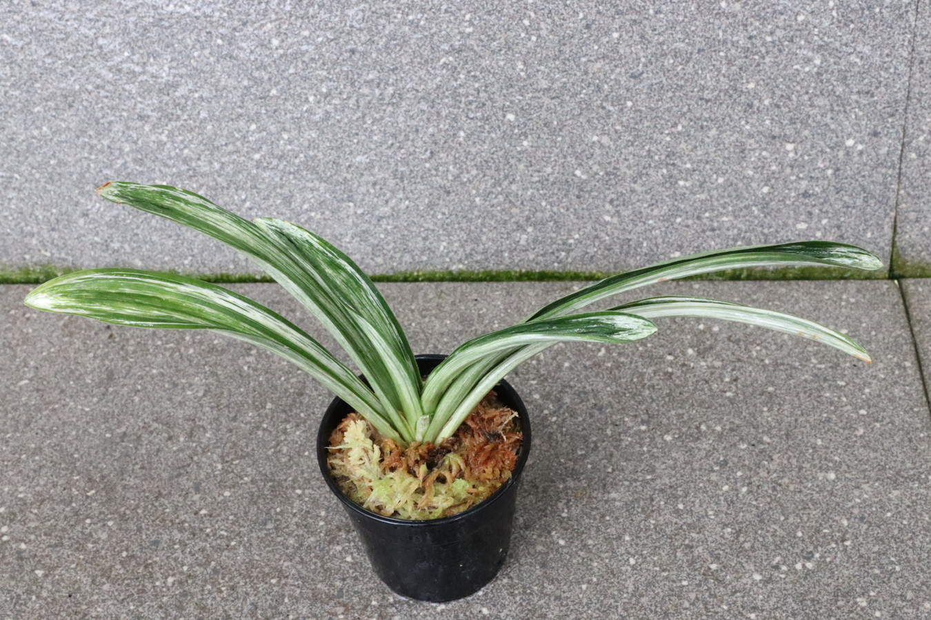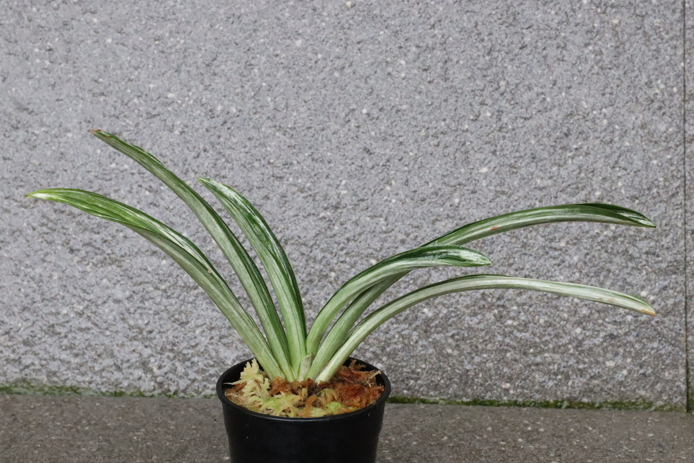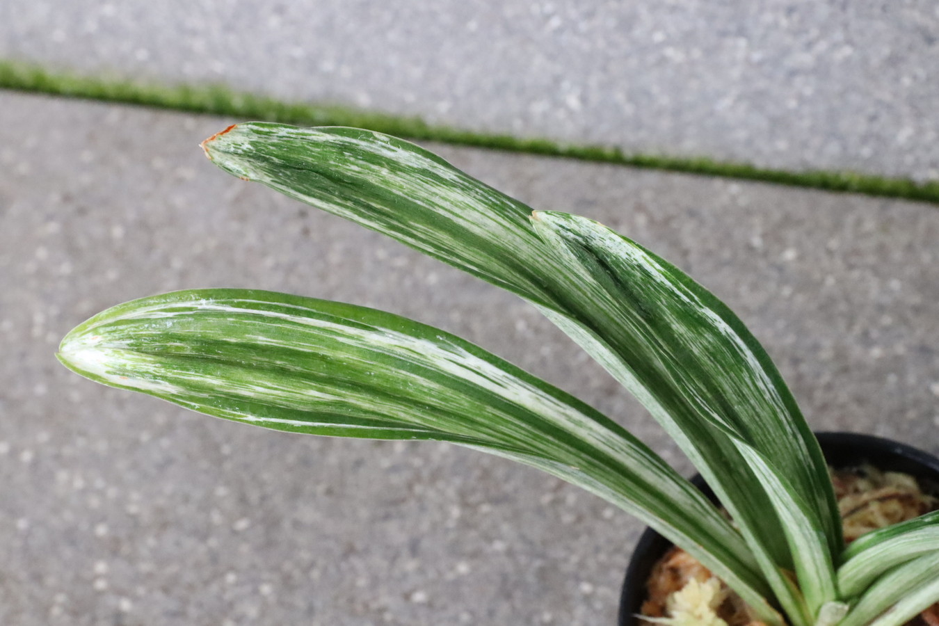 葉長20㎝、葉幅2㎝内外濃紺緑色の覆輪 葉の全面を千代田斑が覆い。雅糸龍・玉龍を見せる。葉先はとがり、採光を強くして栽培すると葉巾は広くなり見ごたえのある姿を見せる。子上の良い品種性質も強いい採光 強~中施肥 強~中繁殖 普通 葉繰り 親になると普通 4~5枚