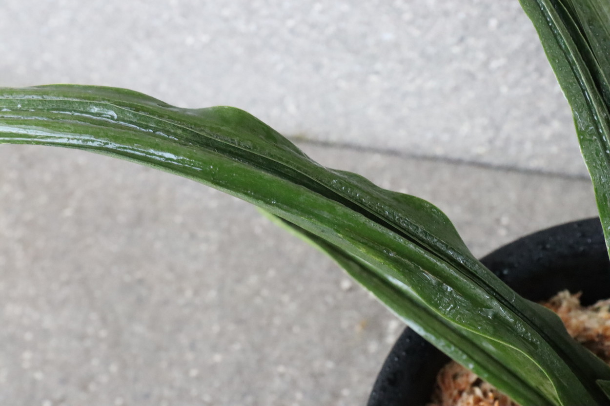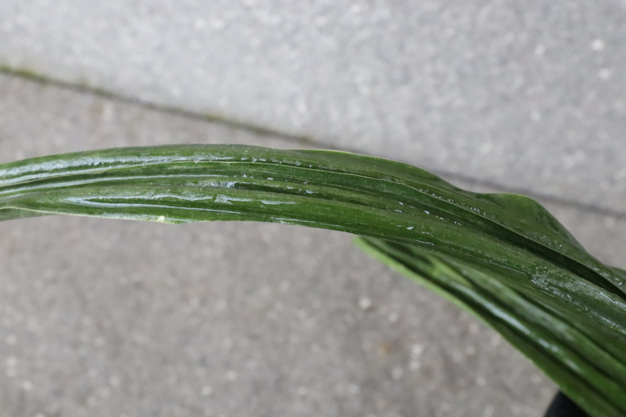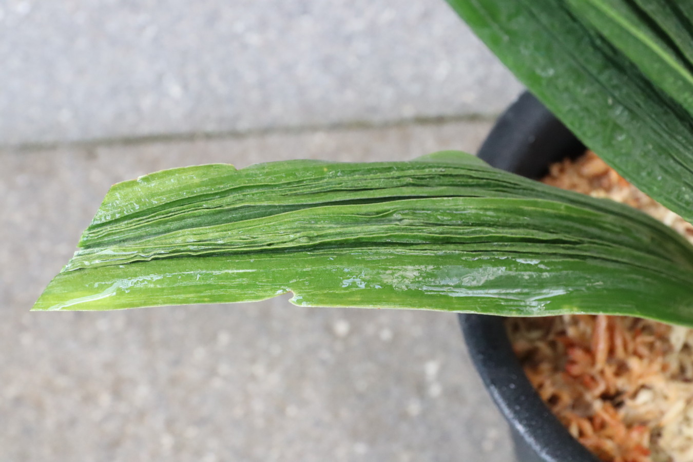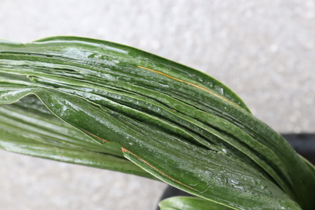 万年青は一つ殖えるのに5年とも10年ともいわれる、寿命の非常に長い植物です。一つ一つの苗でも1-3年ほどかけて育て上げています。その間には台風、猛暑、寒さ、自然の虫など様々な障害をへて育っていくので、完全に無傷の万年青はありません。人以上の寿命のある万年青。風邪を一度も引いたことがない、かすり傷も一度もない人がいないように、ちょっとした傷もある意味、懸命に生きている証。そんな風に考えていただけると有難いです。