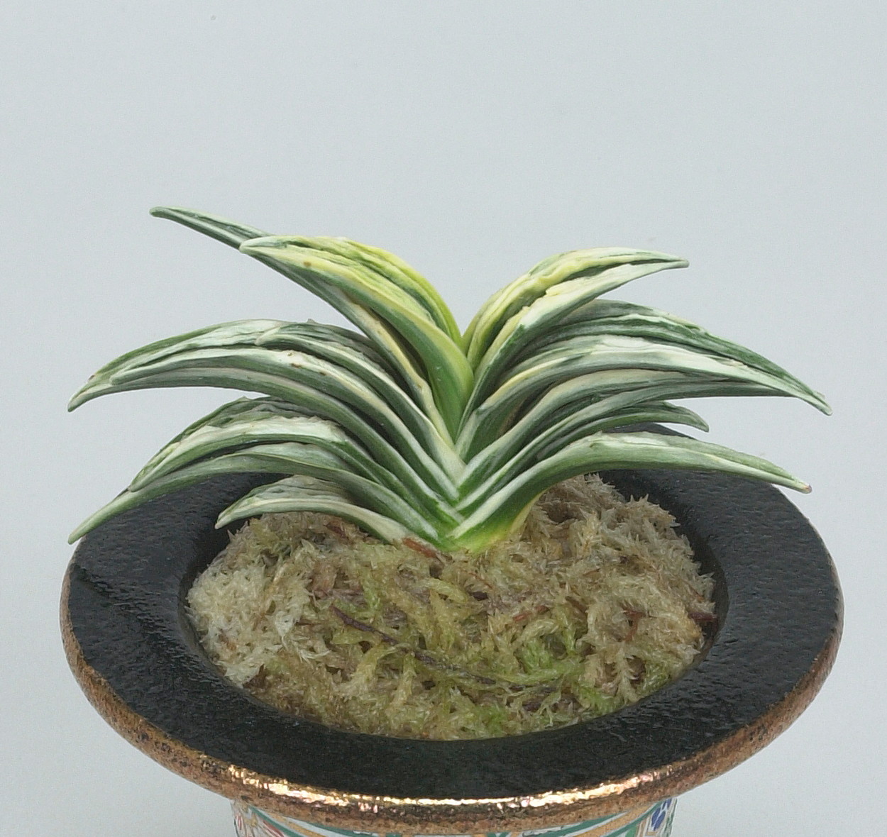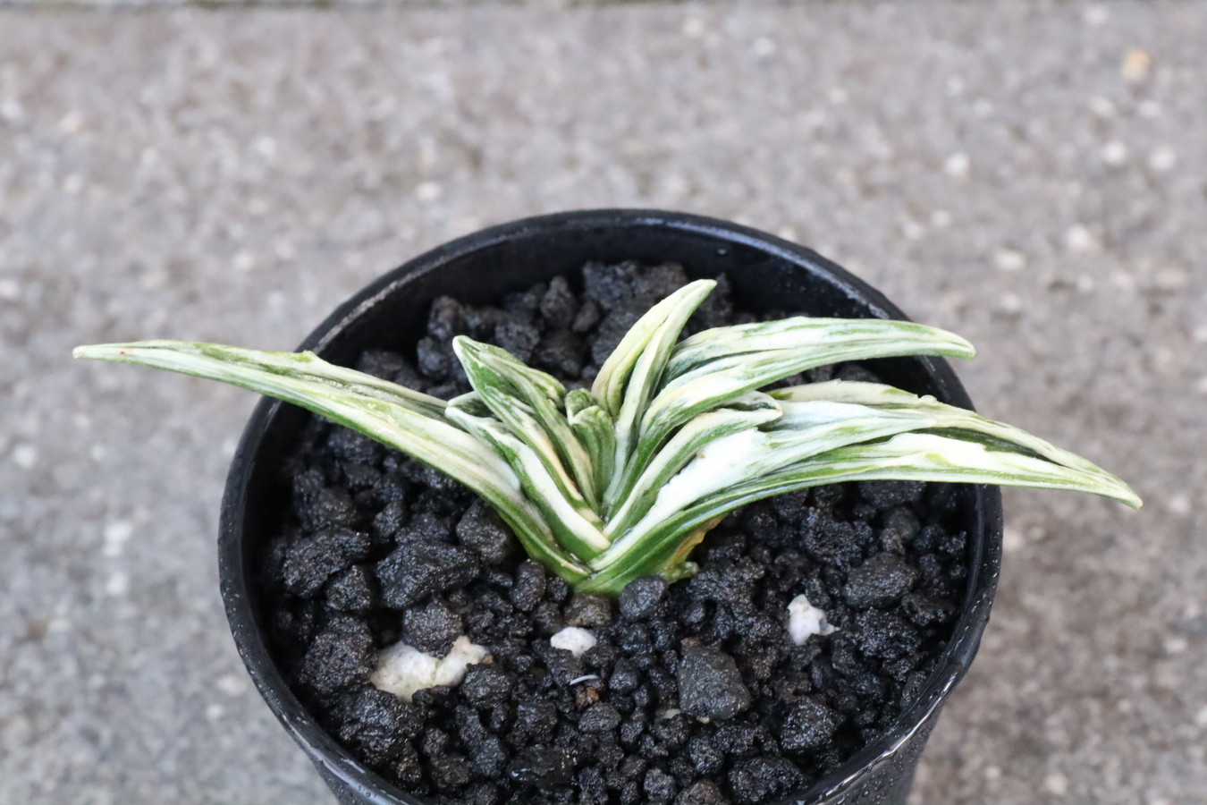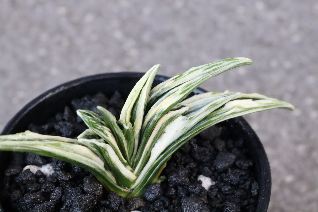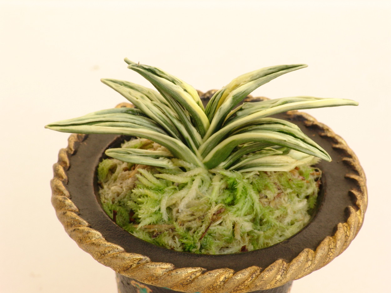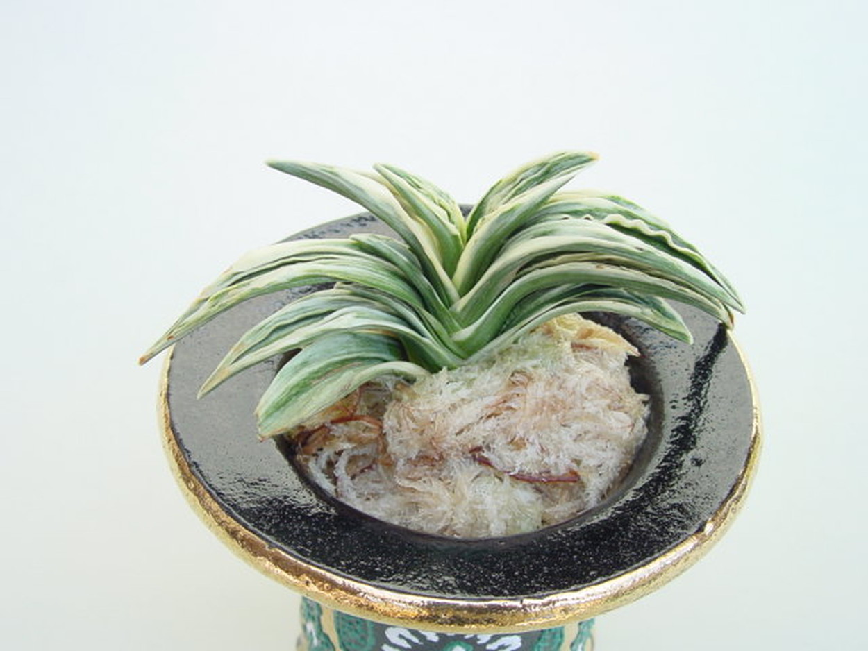 鋭い葉先、純白の雅糸竜は盛り上がり、肉厚の羅紗らしい葉をみせる。小型でしまった姿は、本種のきりりとした魅力を引き出している。若いうちの紺地の強い緻密な地合い、葉姿の乱れることのない端正な姿も魅力の作り易い品種。性質は強健、採光、肥料は強め。芋吹き良く吹き上がり、子上げもする。