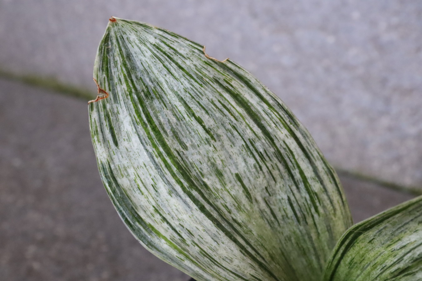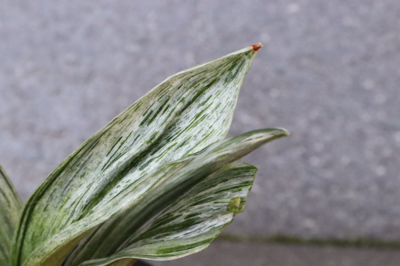葉の全面を雅糸竜が覆うこともあり、芸非常に強い。日の具合がちょうどよいと、葉の半分が千代田斑に、半分が雅糸龍になり、時おり、玉龍を見せる。葉先はとがる。