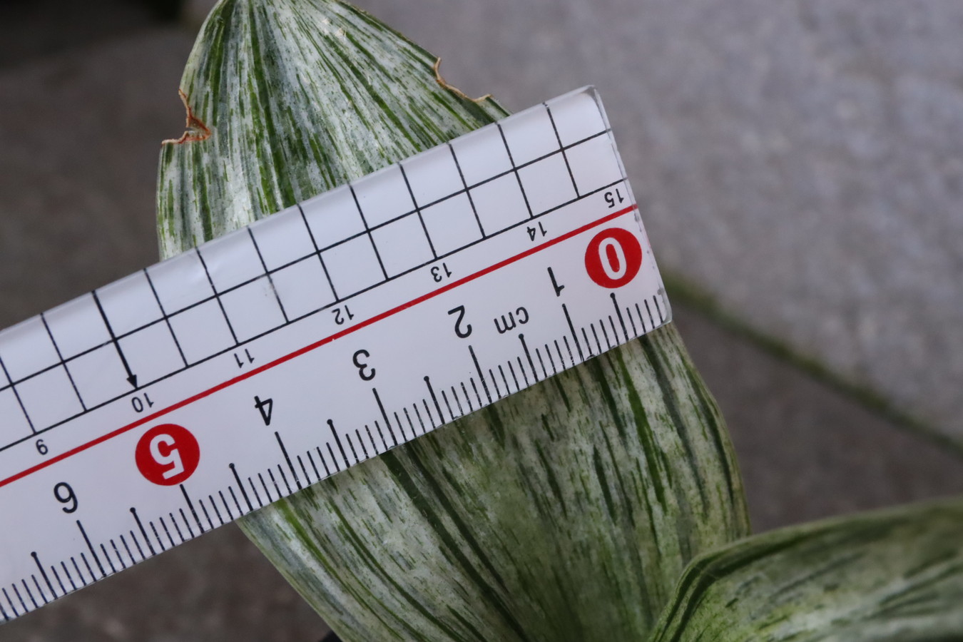 葉長10㎝、葉幅3㎝内外。葉肉が厚く、立ち葉で襟組良く、左右均整の取れた姿は気品高く、千代田系の中でも独特な個性を持っている。特に地合いは羅紗地に近く、葉芸はこの品種特有の節目のさざ波のような雅糸竜を現し、純白の千代田斑を引き立たせる。薄葉系の美しさと羅紗系の力強さを兼ね備えた逸品である。葉肉があるため採光を少々強くしても良い。千代田系では丈夫な品。