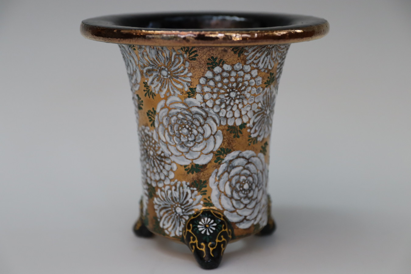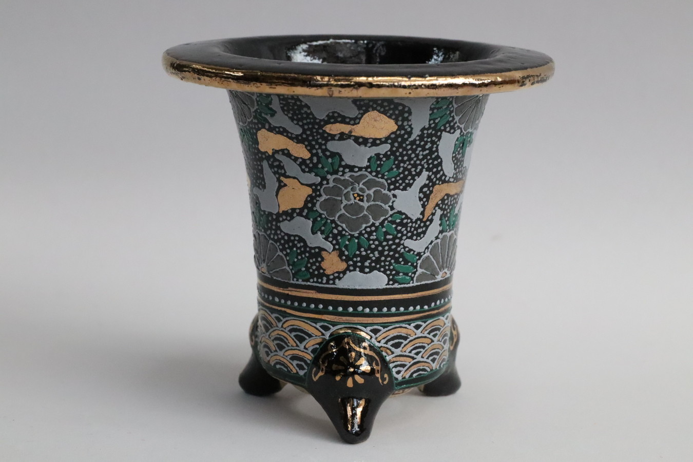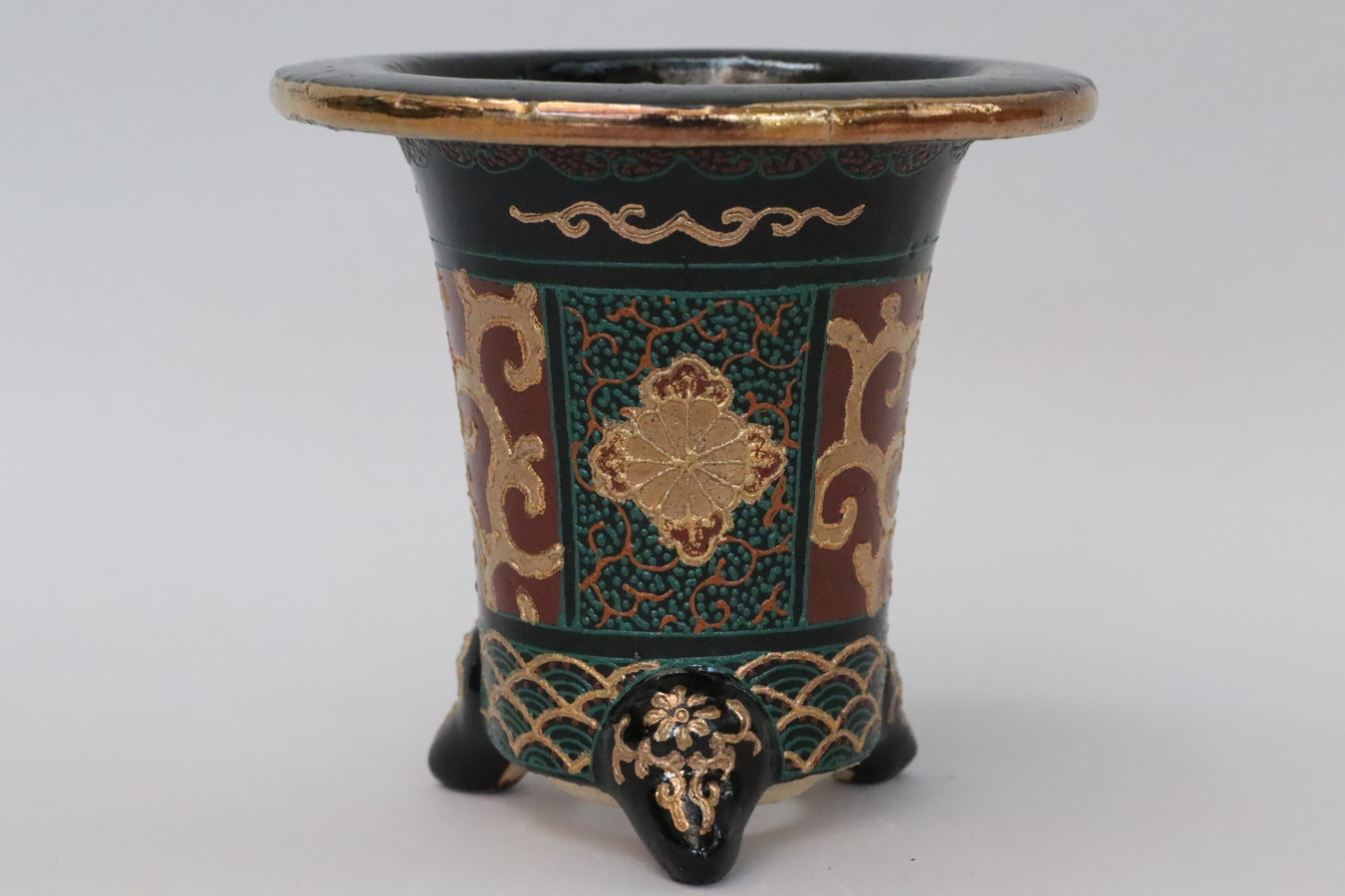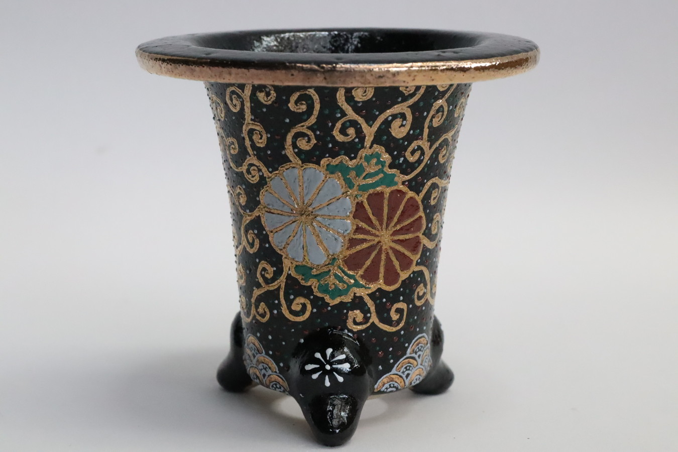 2243,金銀菊唐草 萬年青楽鉢 外径約10.3㎝ 華サイン賀茂黒