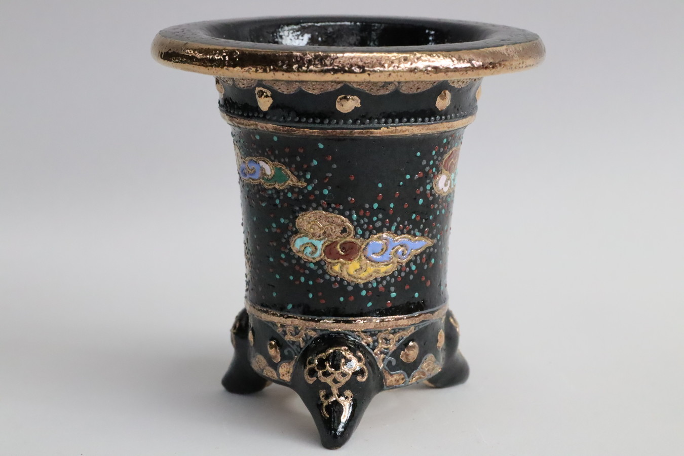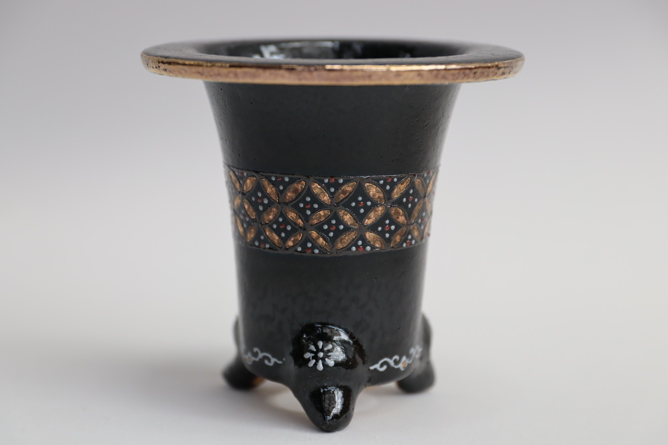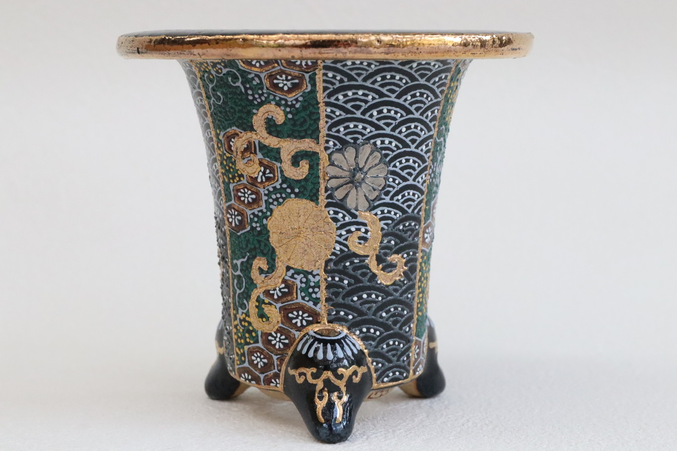 2243,金銀菊唐草 萬年青楽鉢 外径約10.3㎝ 華サイン賀茂黒