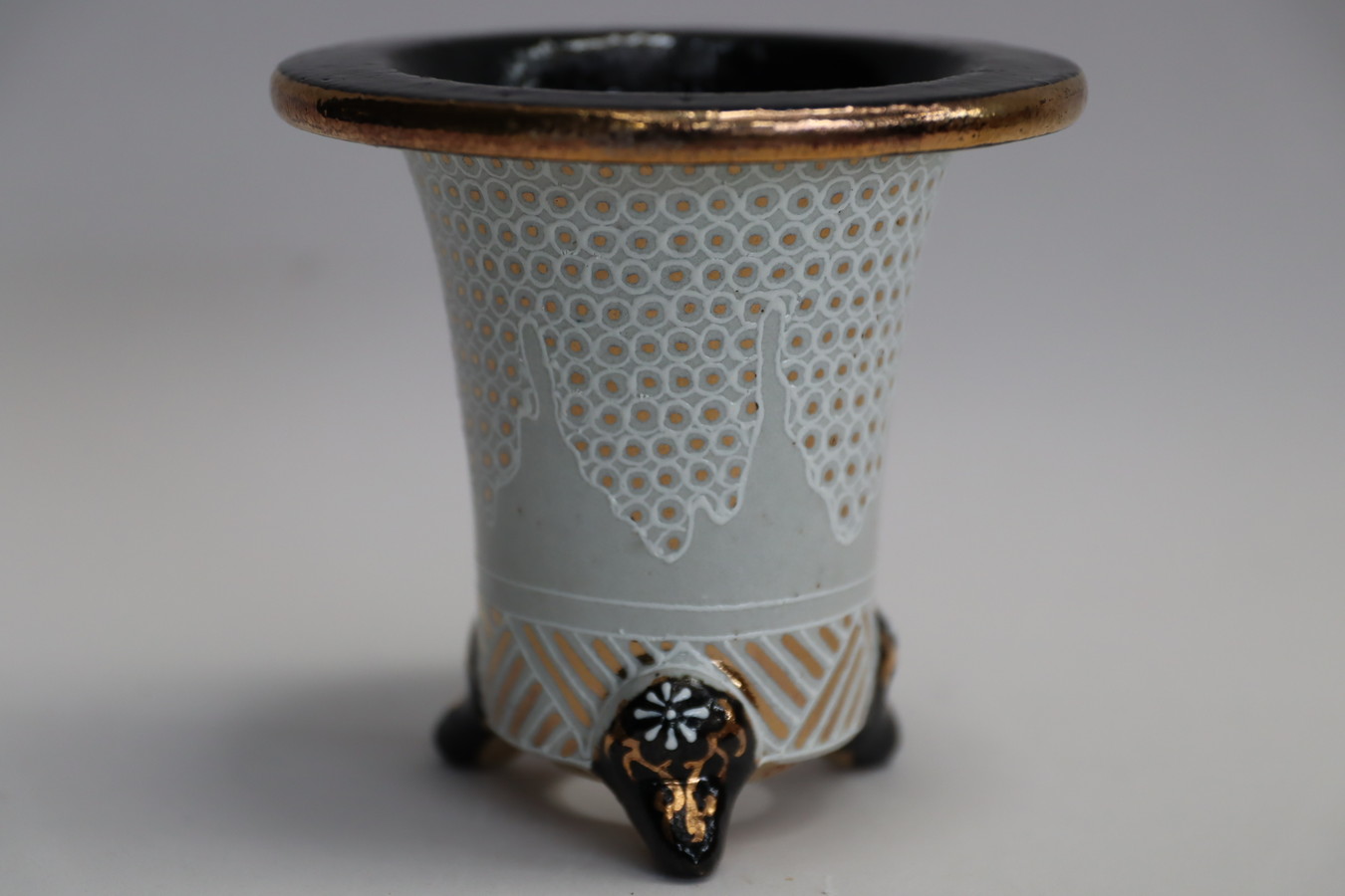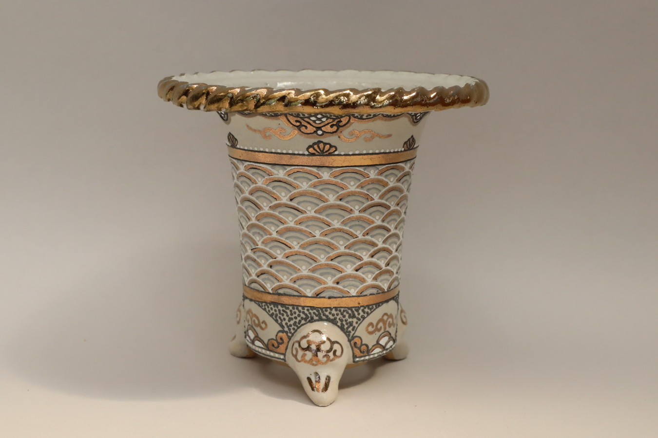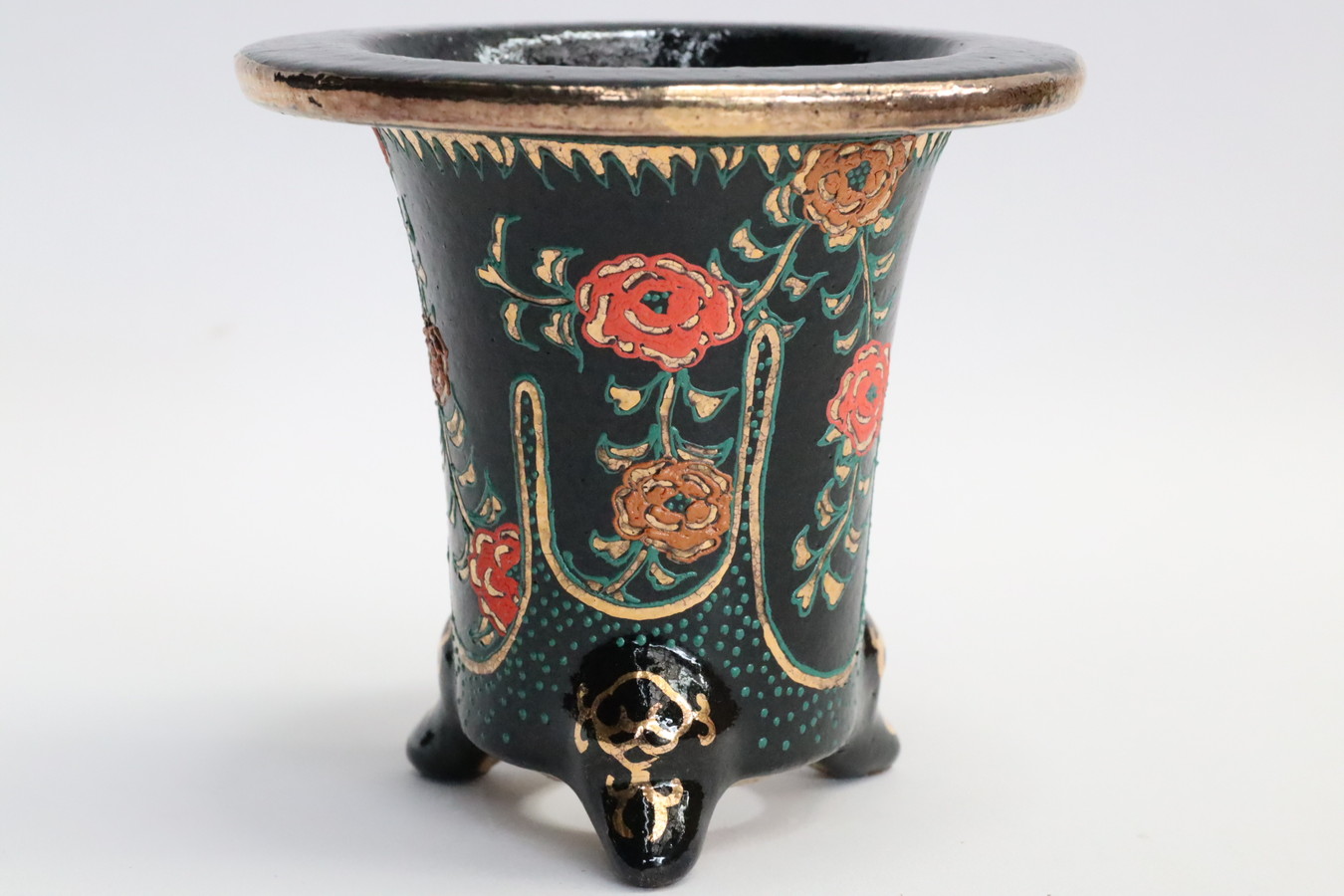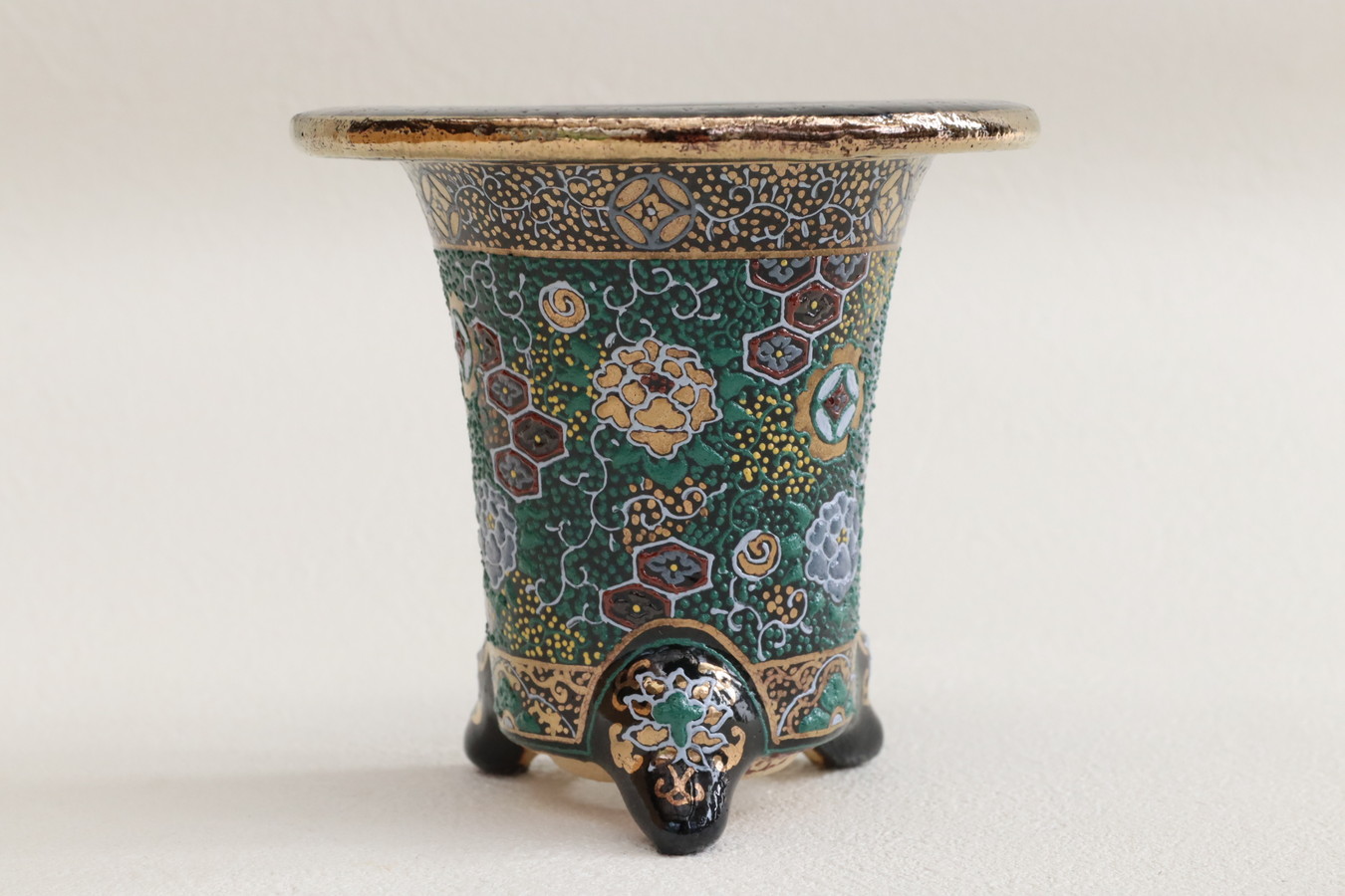 2243,金銀菊唐草 萬年青楽鉢 外径約10.3㎝ 華サイン賀茂黒