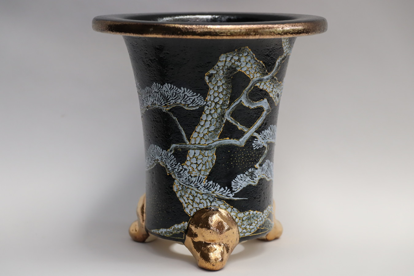 4631,大鉢 黒地松 外径約21.8cm 東園絵 新古?中古?【送料無料】