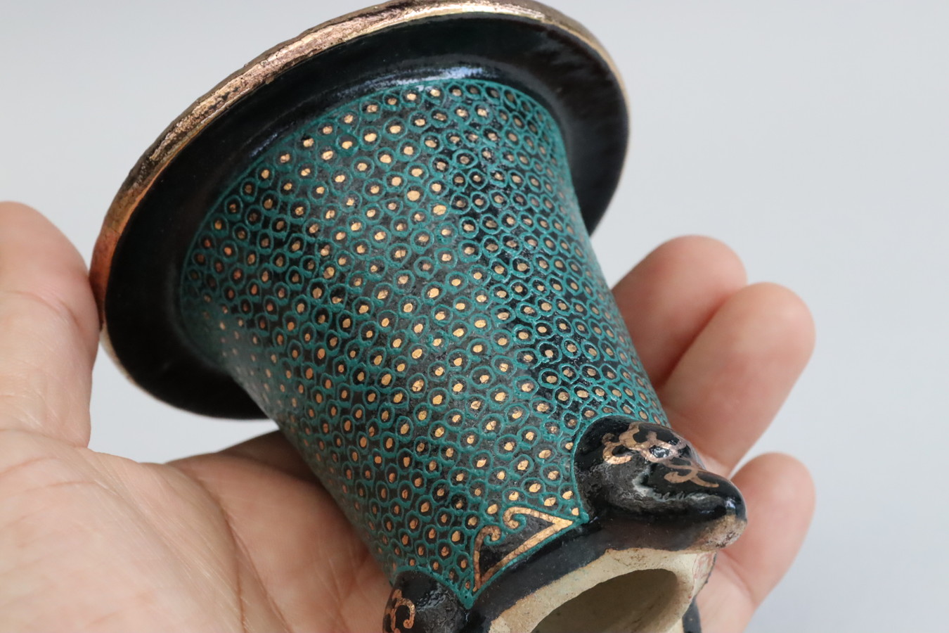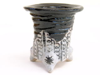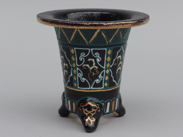 2531,古代鉢 華唐草雷紋 万年青鉢 外径約8.4cm 高さ約9.4cm この形製作極少