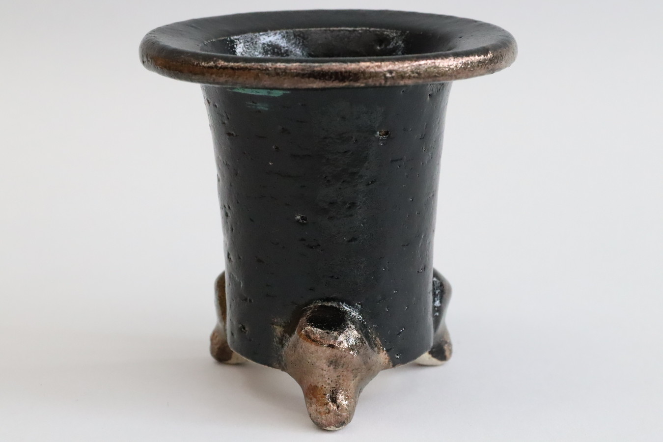 2464, 古鉢 賀茂黒 縁金鉢 縁足金 万年青鉢 鉢外径約8.2cm ハサミあと 重さや黒の艶ちがう