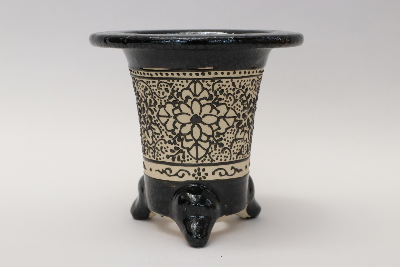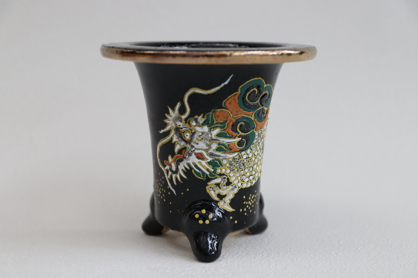 2109,金〆五龍華 万年青楽鉢 外径約10.1cm華サイン 加茂黒 太鼓胴 傑作コレクション