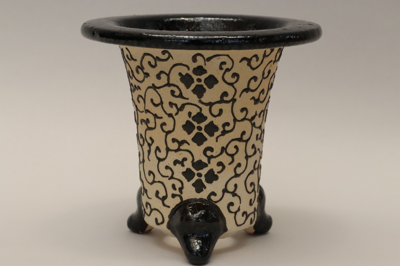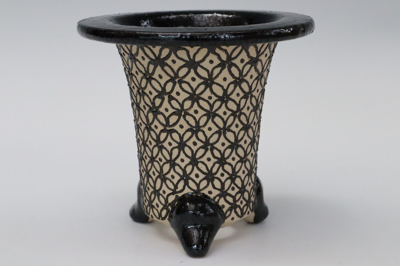 2662,金〆五龍華 賀茂黒楽鉢 外径約10.2cm 高さ約9.3cm華サイン 加茂黒 独特な鉢の形