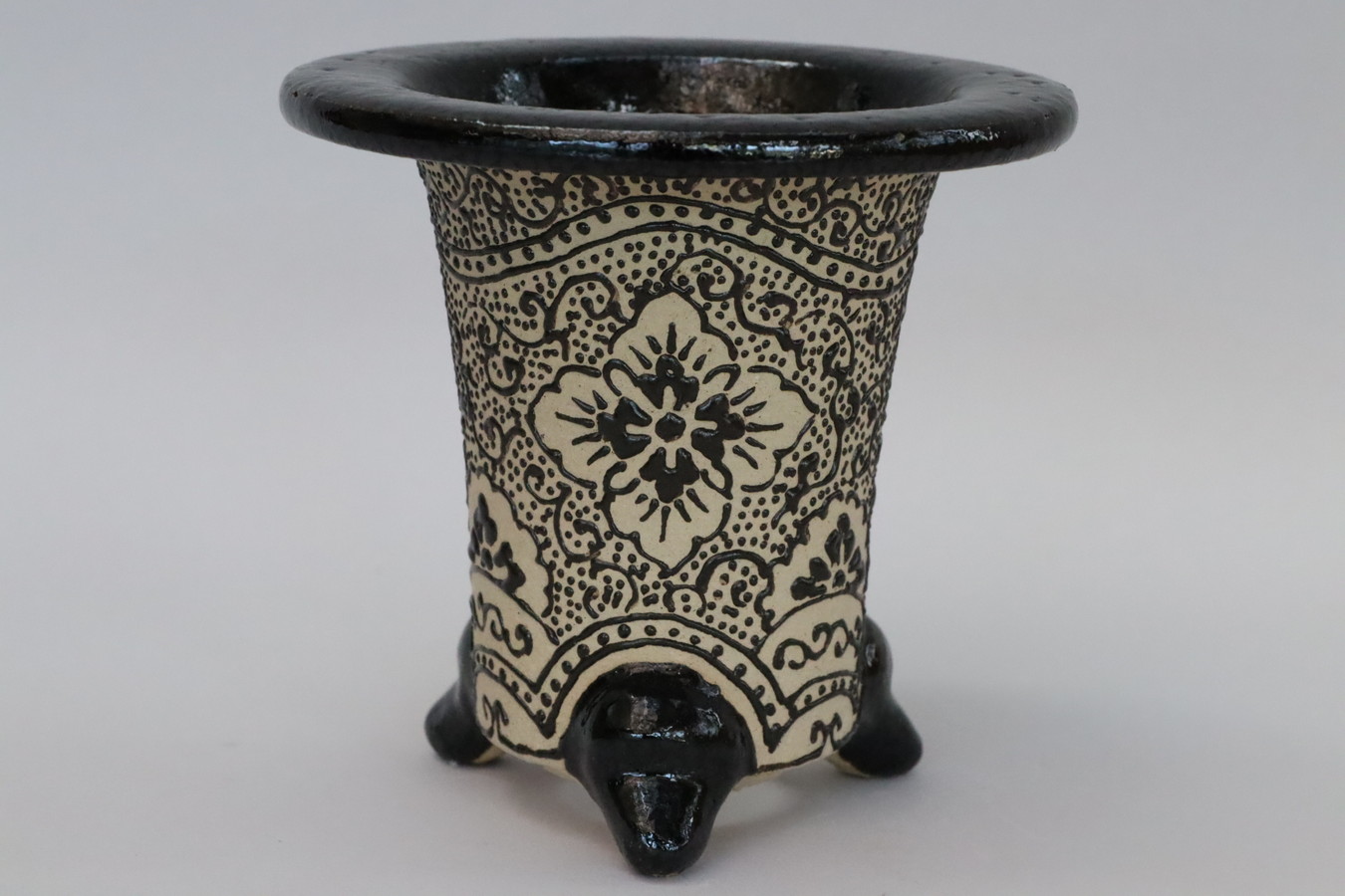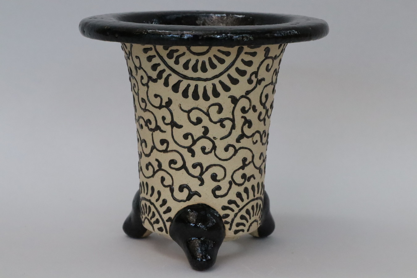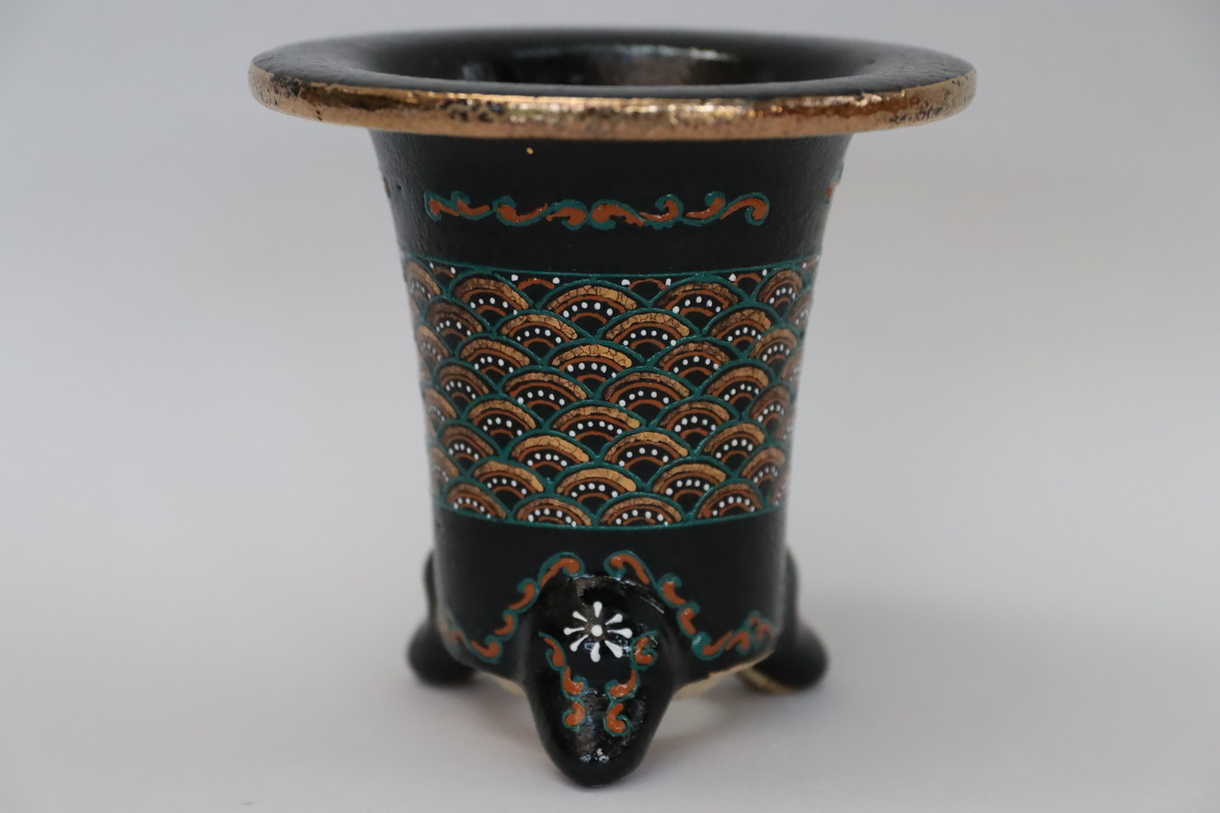 2358,古代鉢 七宝唐草 おもと樂鉢 外径約10.6cm 高さ約10.9cm 縁浅胴太珍鉢