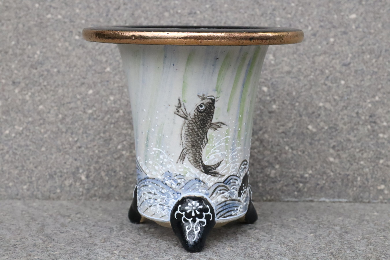 3172,清流 鯉の滝登り 登龍門滝楽鉢 外径約12.1cm 亘サイン 作よい【43000円→大特価!】