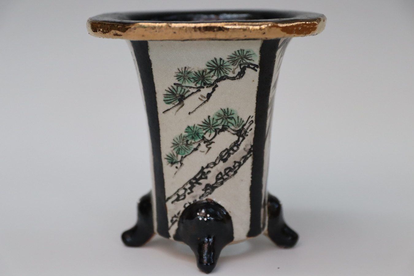 2662,金〆五龍華 賀茂黒楽鉢 外径約10.2cm 高さ約9.3cm華サイン 加茂黒 独特な鉢の形