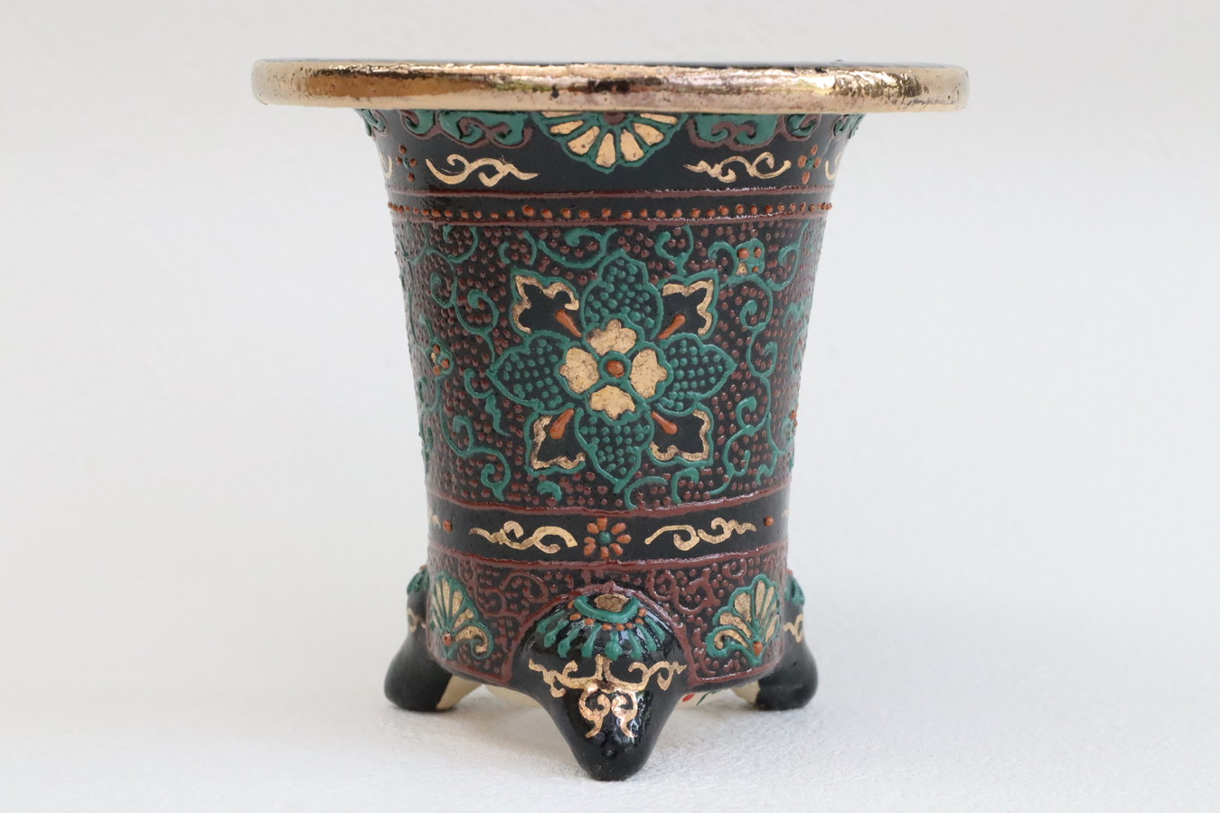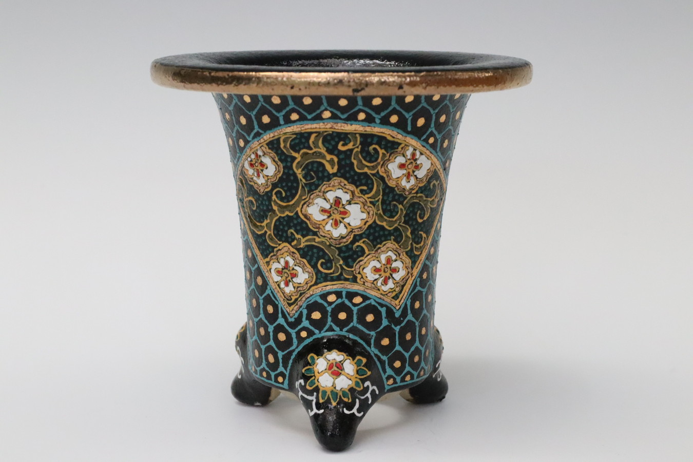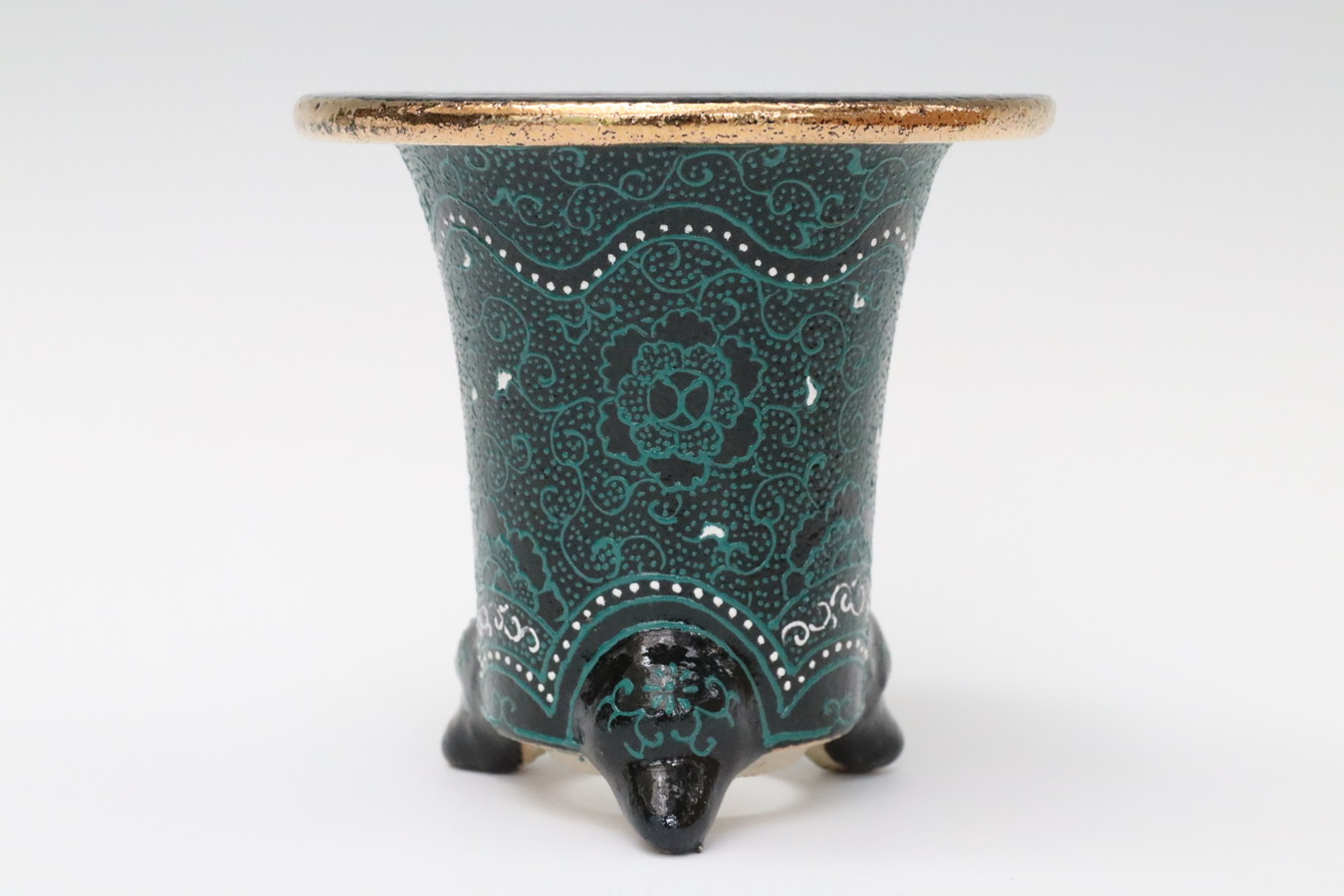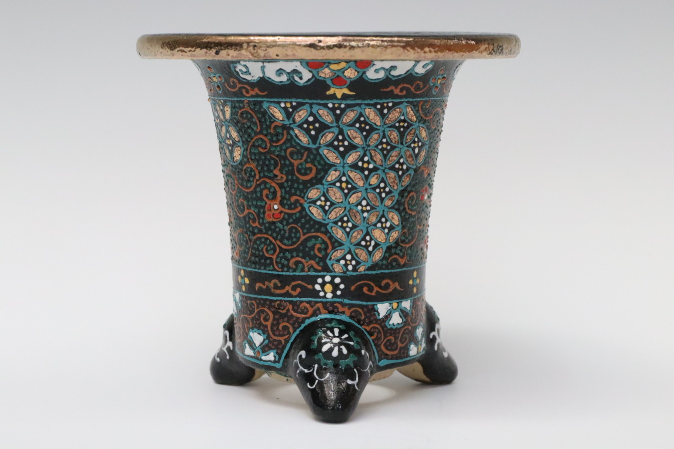 3086,縄縁太胴 七宝唐草鉢 萬年青錦鉢 外径約11.6cm 高さ約10.0cm 梅花サイン 縁起よい祝い鉢