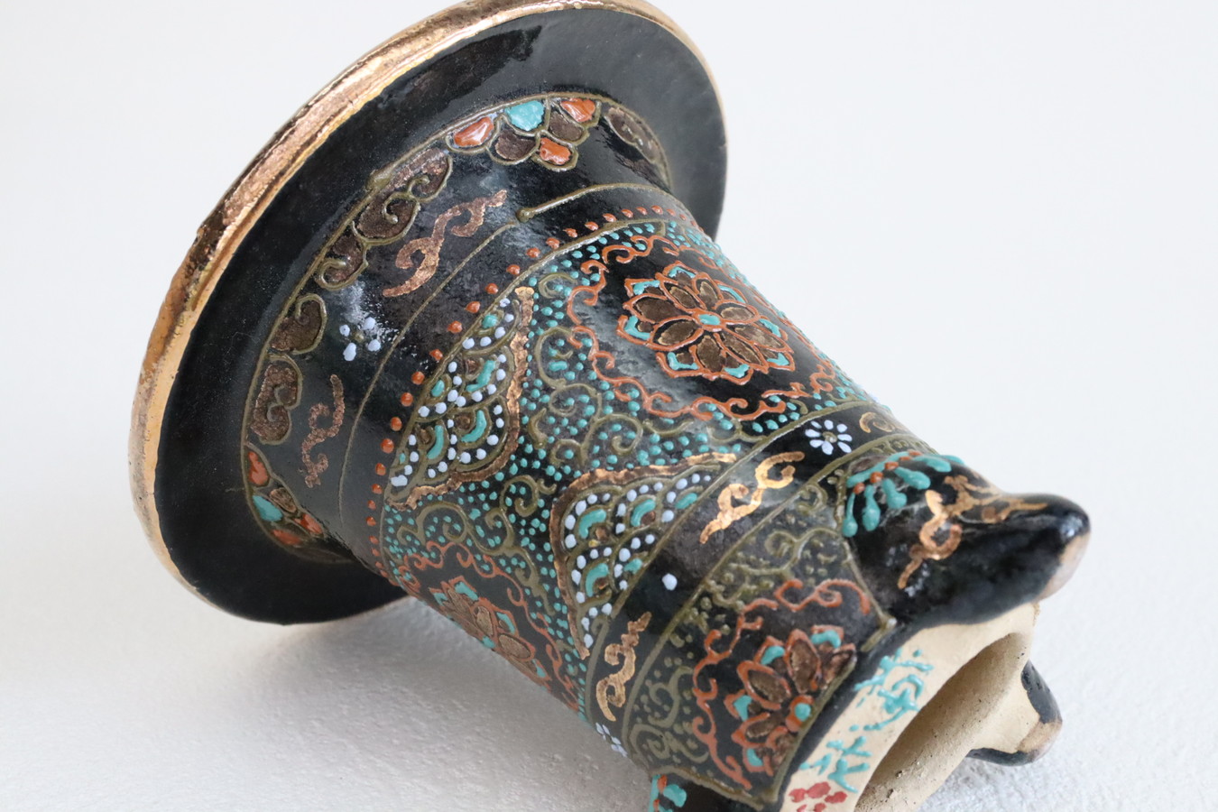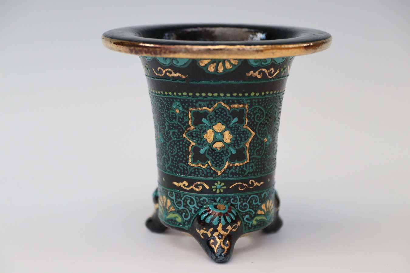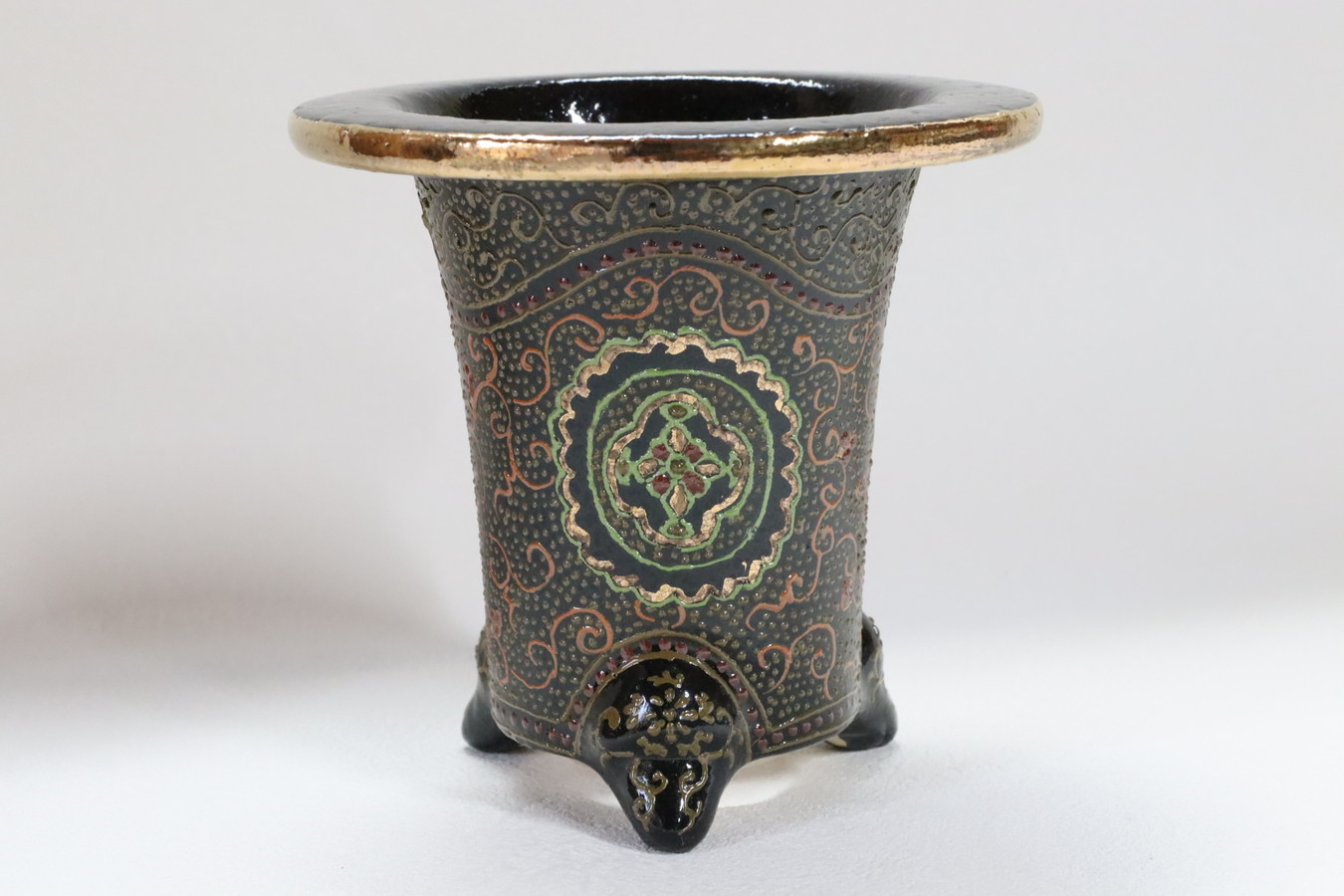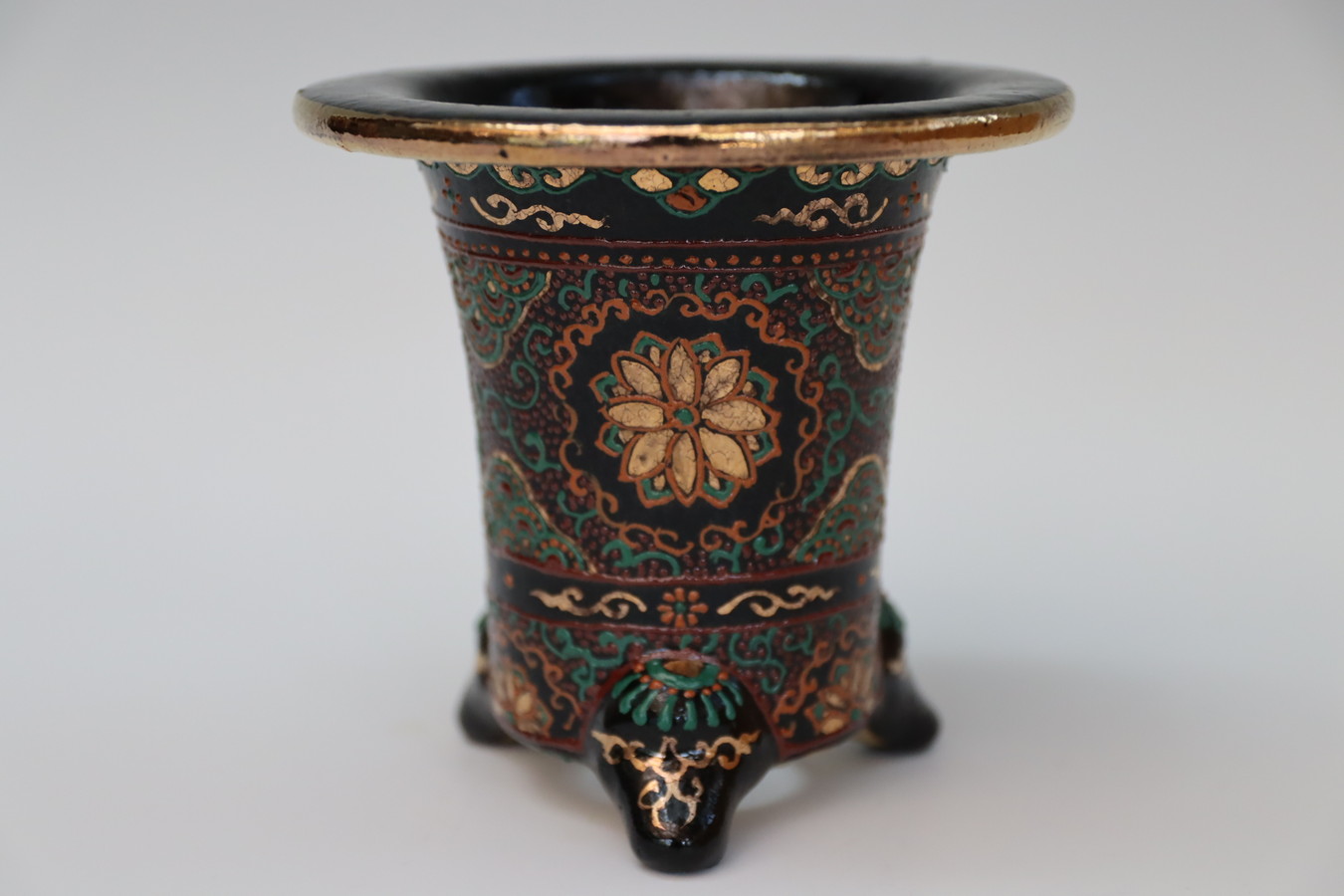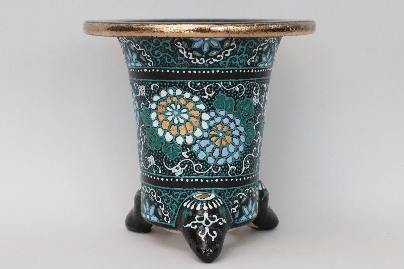 3086,縄縁太胴 七宝唐草鉢 萬年青錦鉢 外径約11.6cm 高さ約10.0cm 梅花サイン 縁起よい祝い鉢
