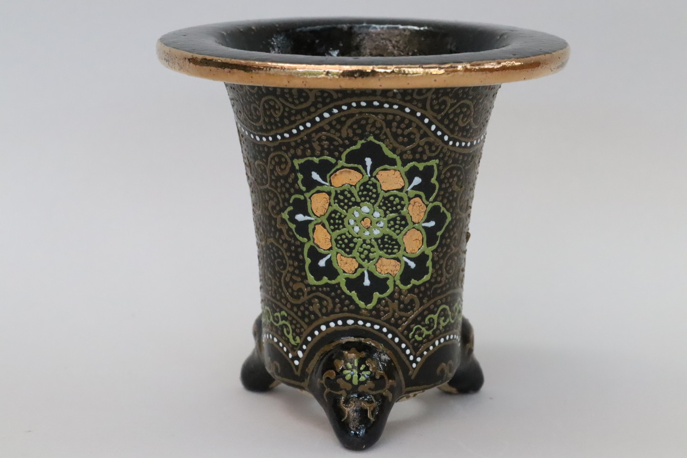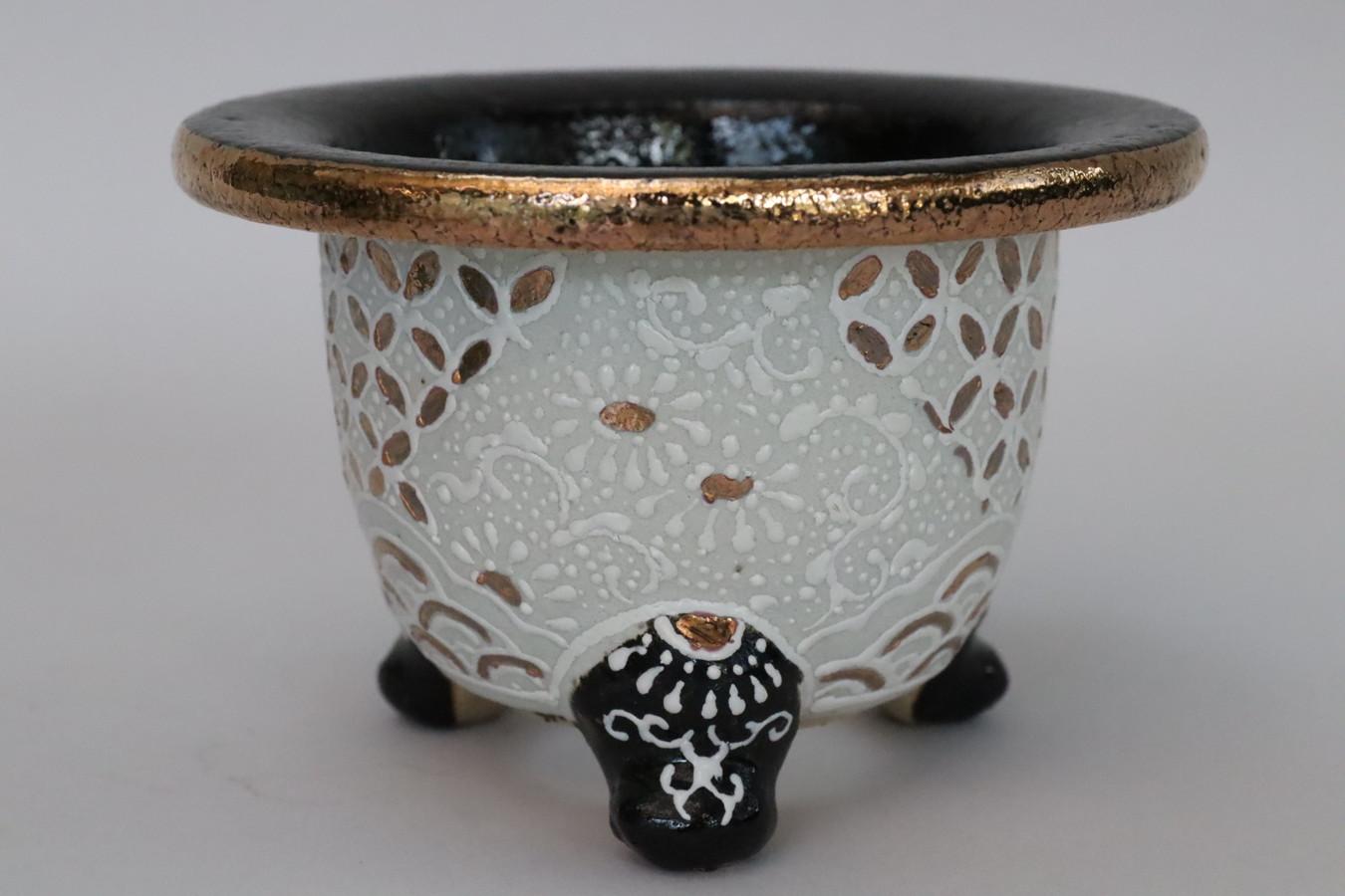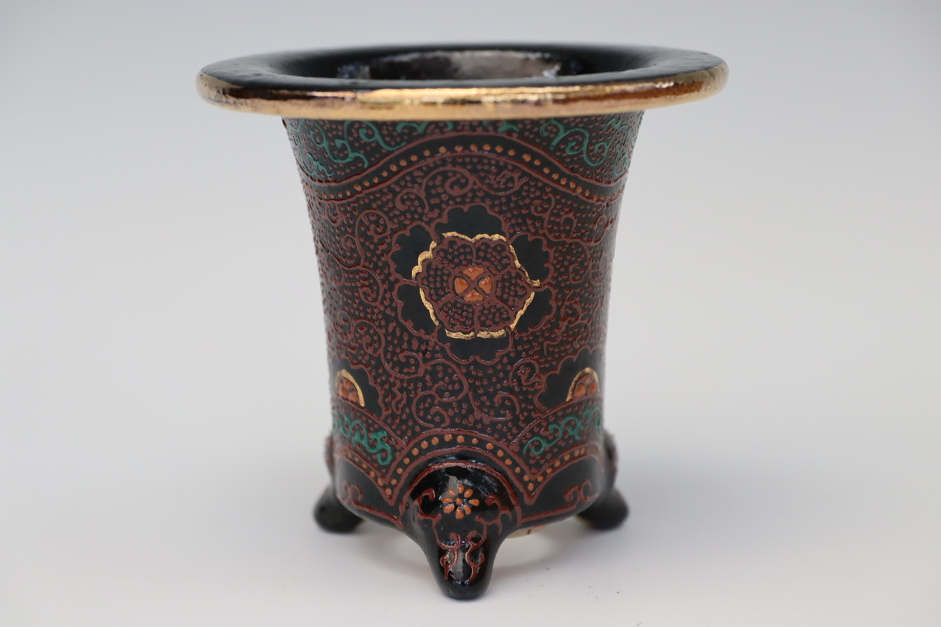 3061,ラン鉢 百花繚乱 外径約10.2cm 高さ約11.9cm 梅花サイン 加茂黒 万年青楽鉢 【傑作】