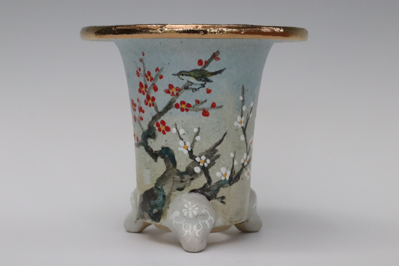 2270,紅白梅に鶯〈ウグイス〉 彩色錦鉢 外径約10.8cm 梅花サイン